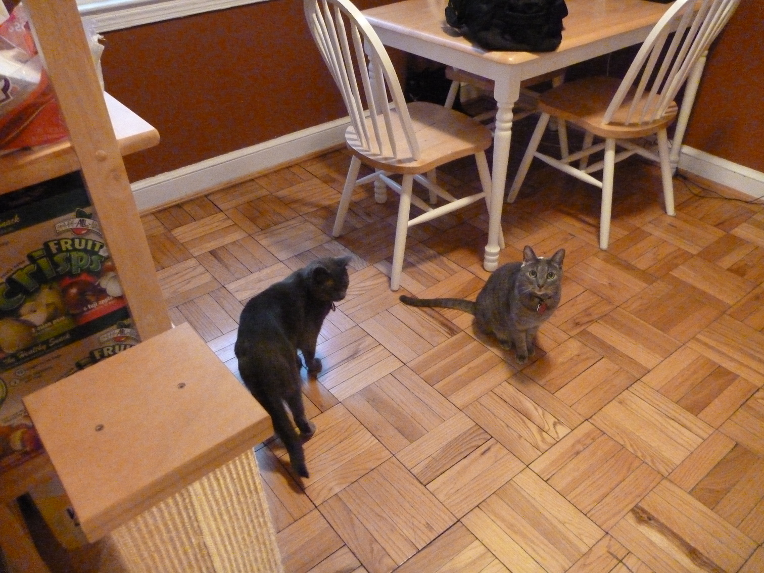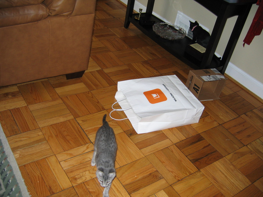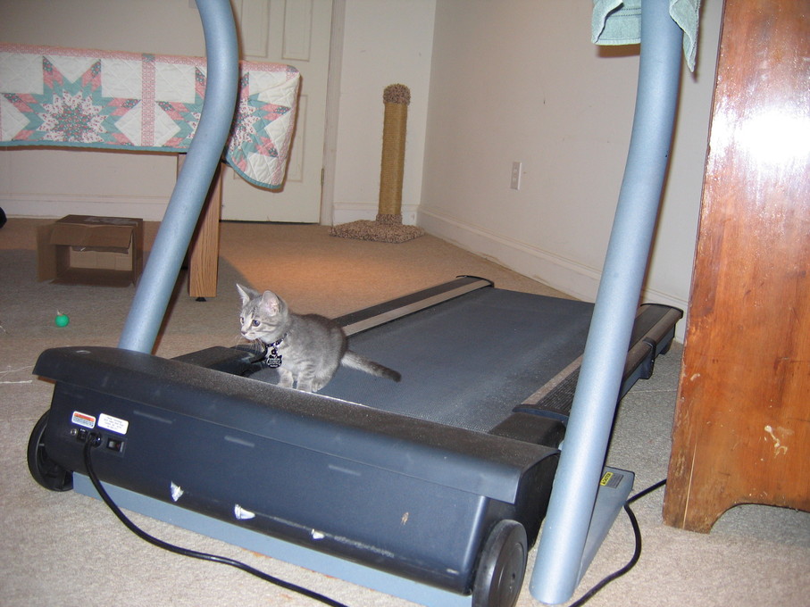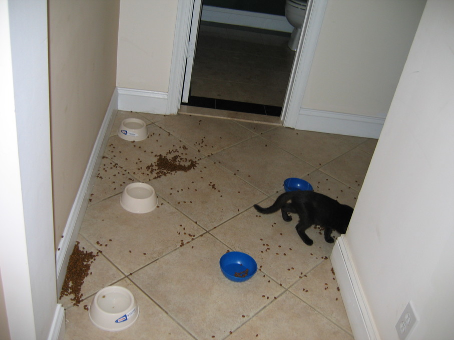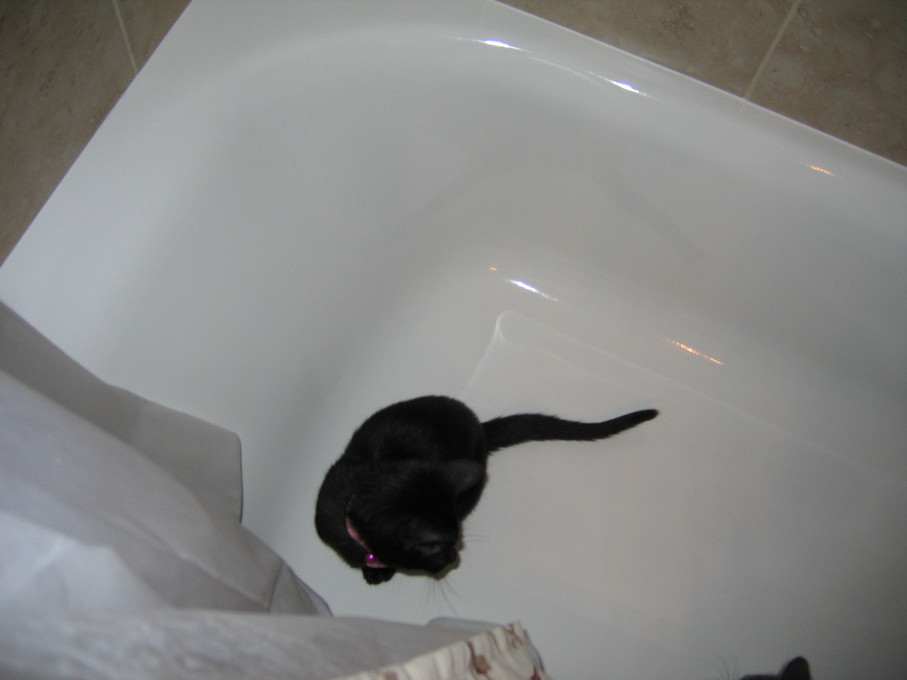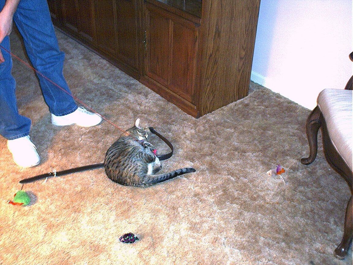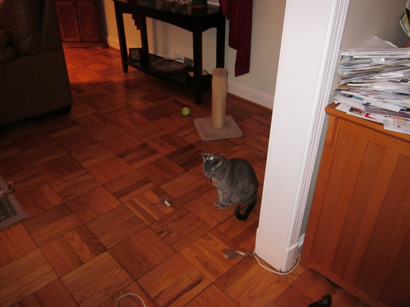 Zathras examining the part of the cat tower that broke off.