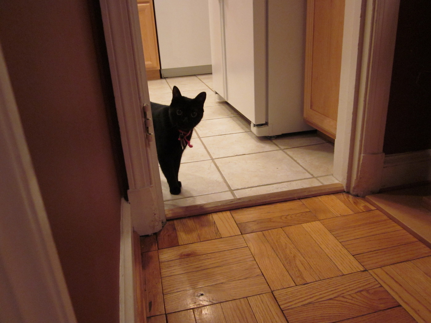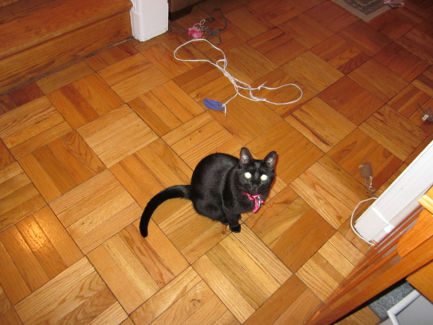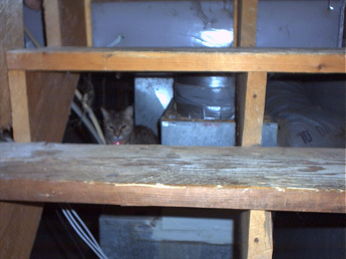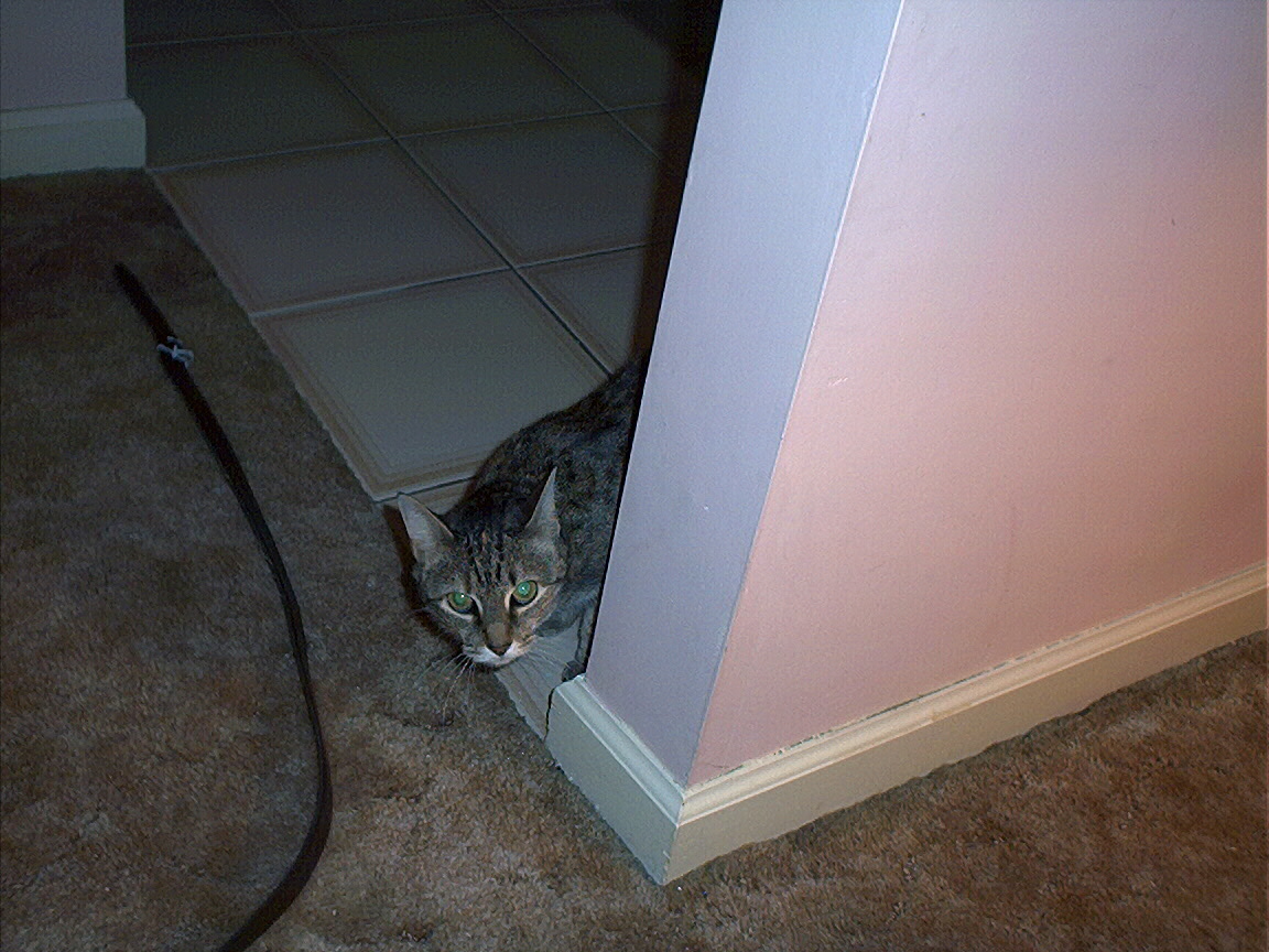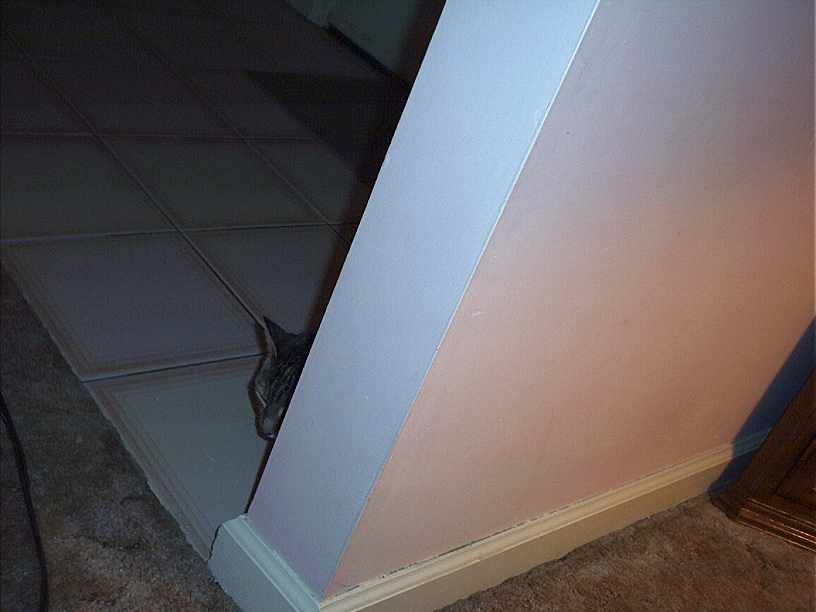 Electra peeking around the stairs