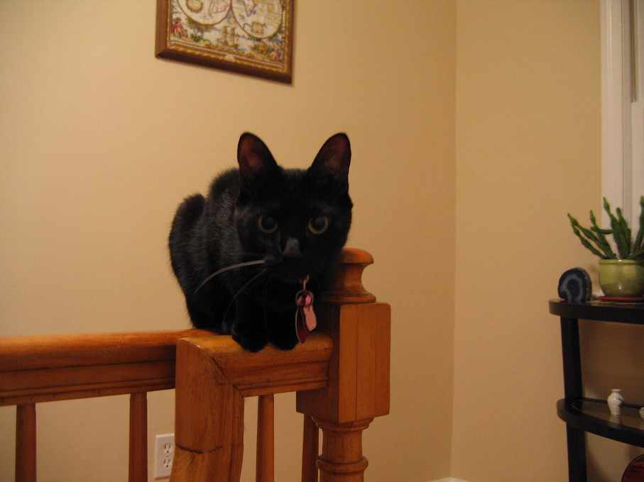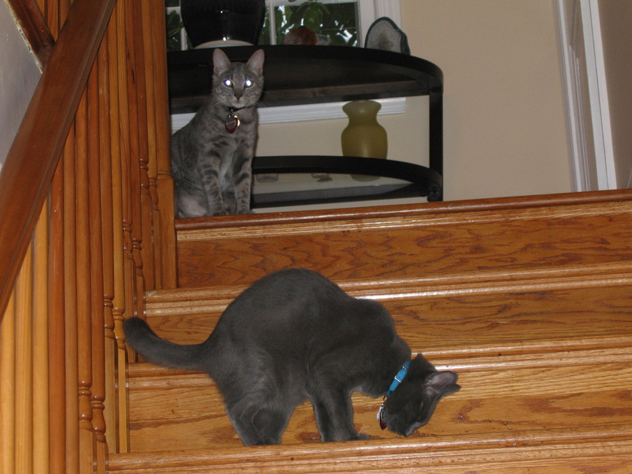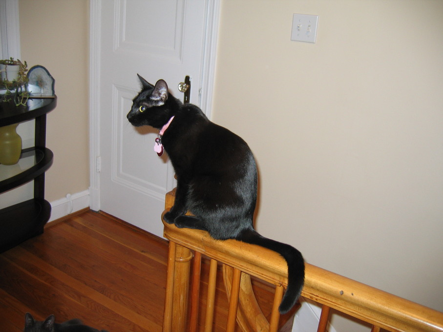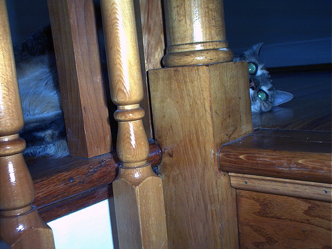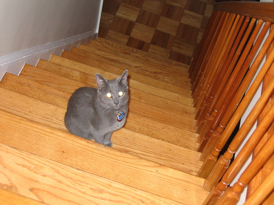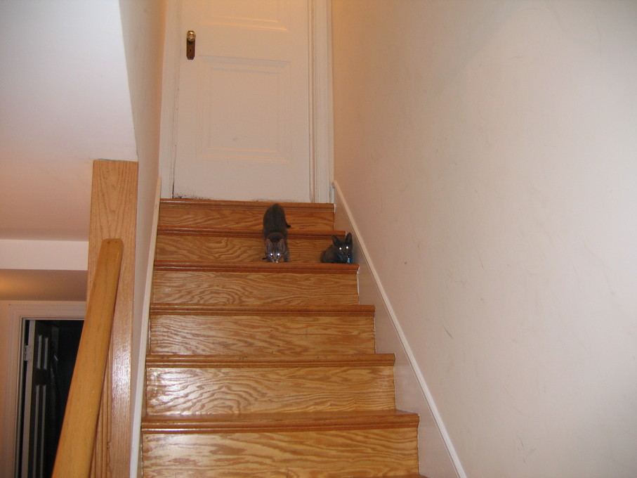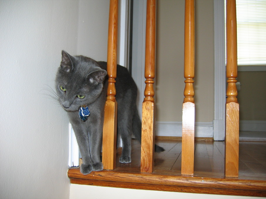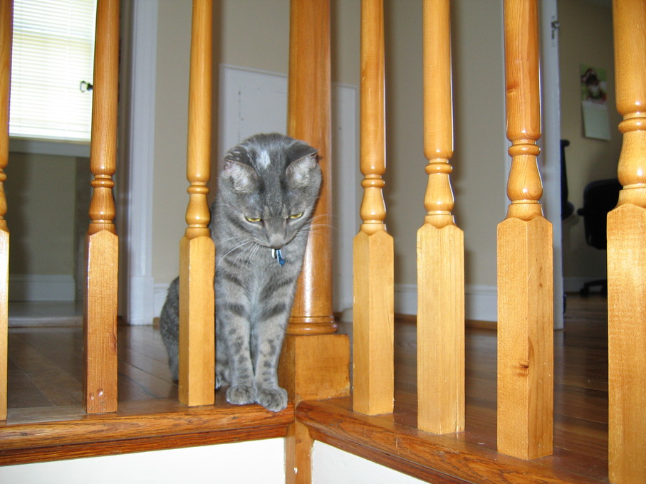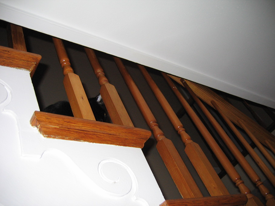 Rascal peeking down the stairs.