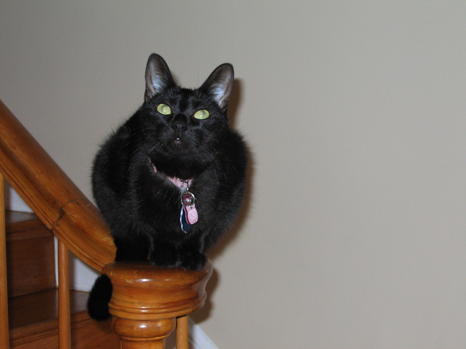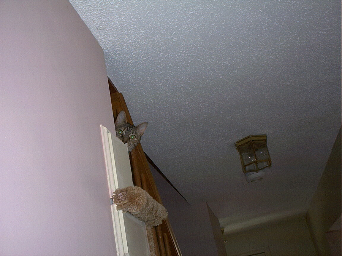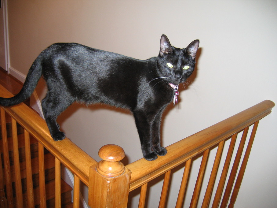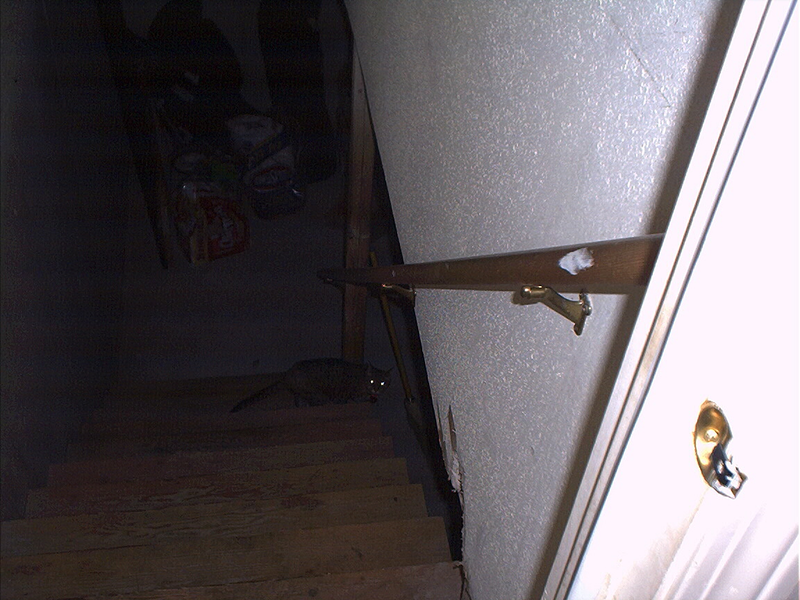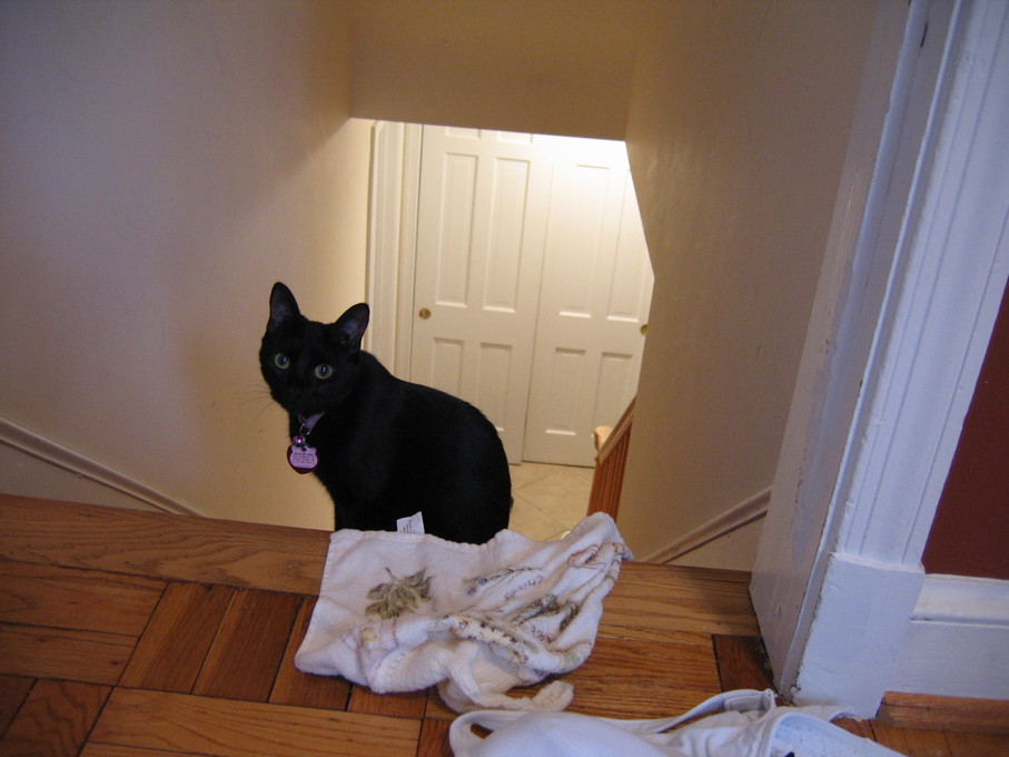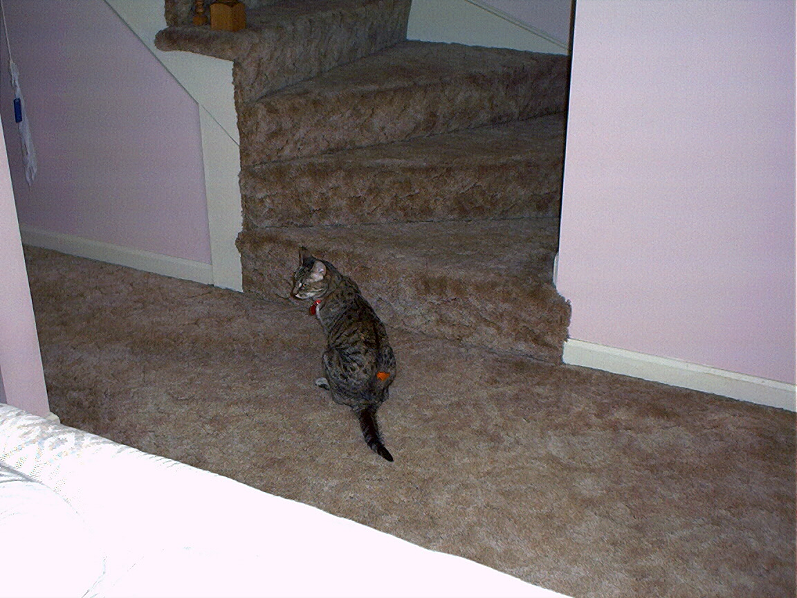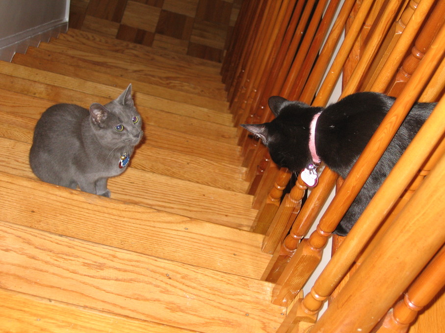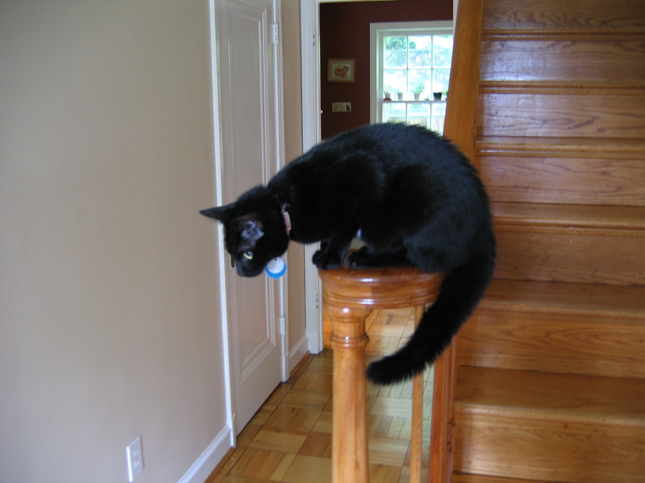 Rascal peeking down the stairs.