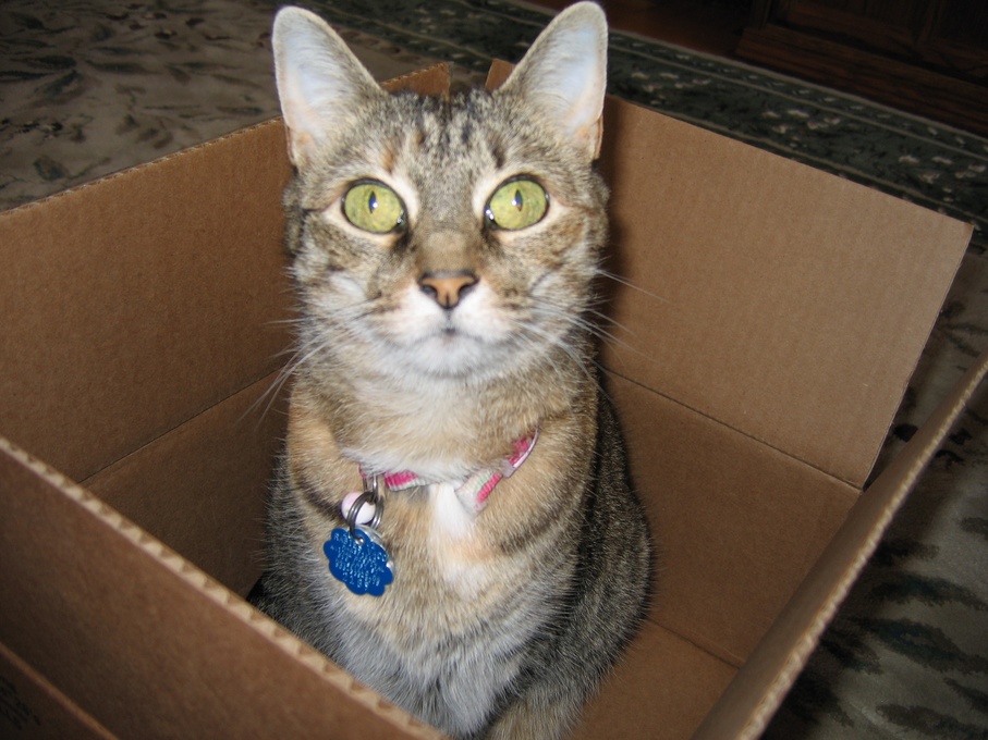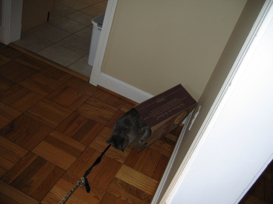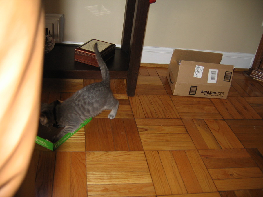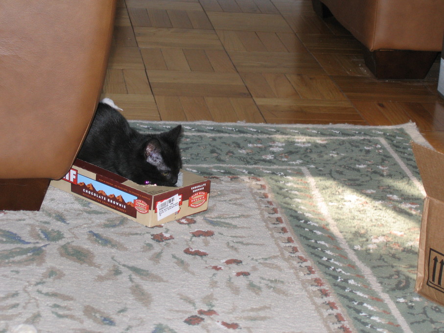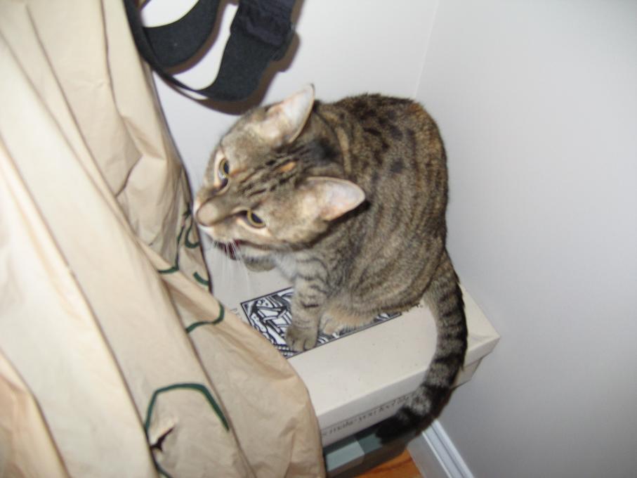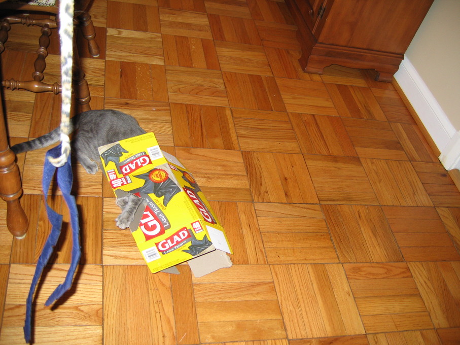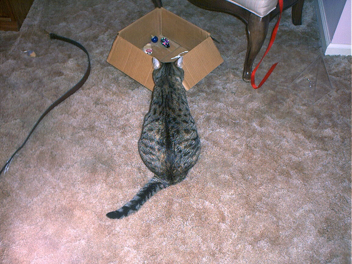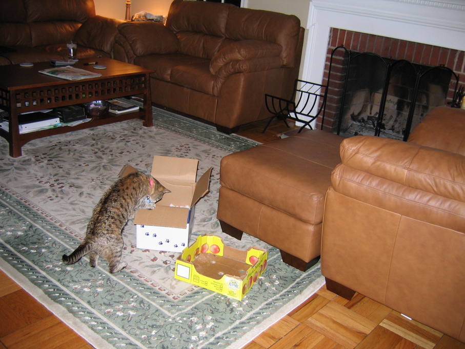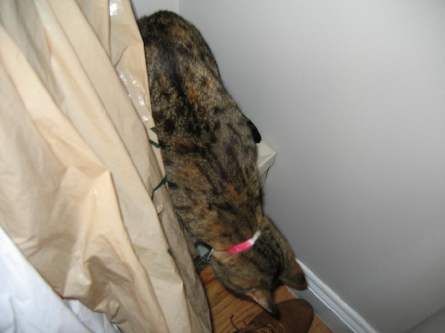 Electra sticking her paw into her box