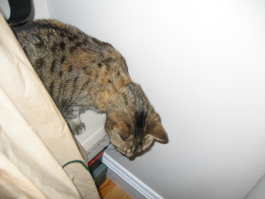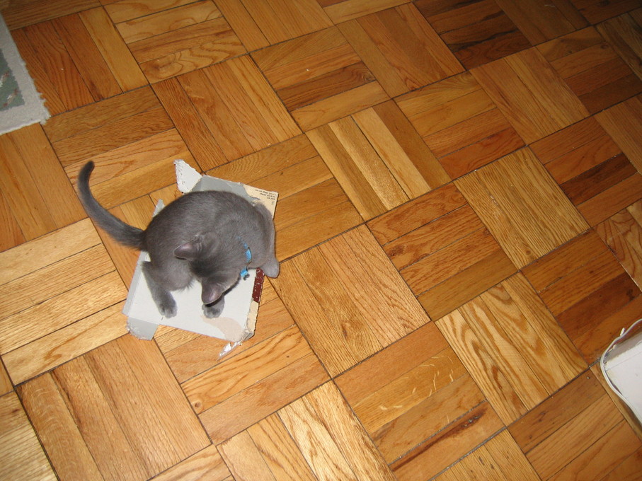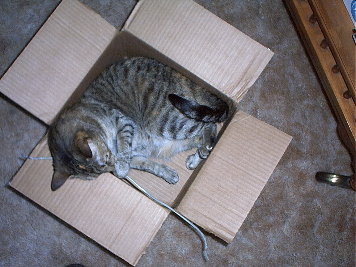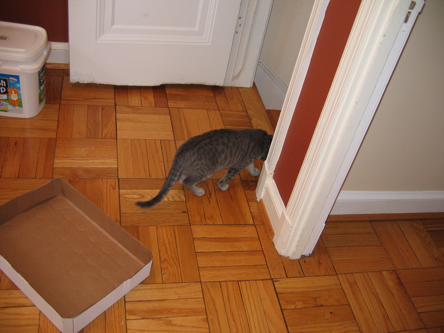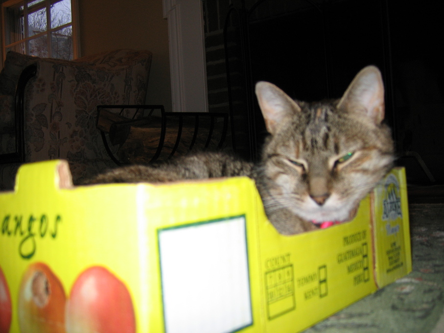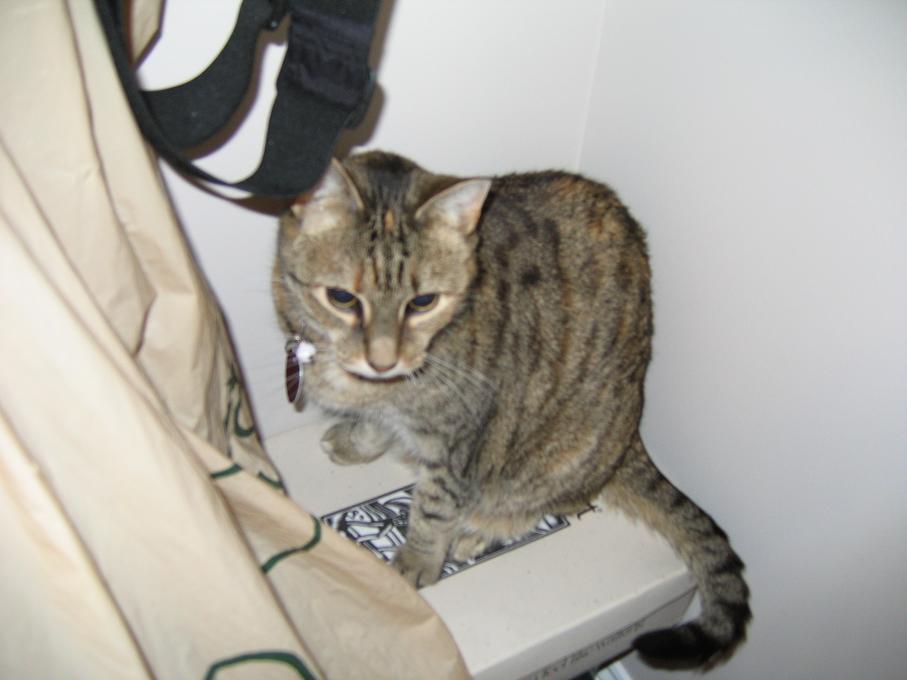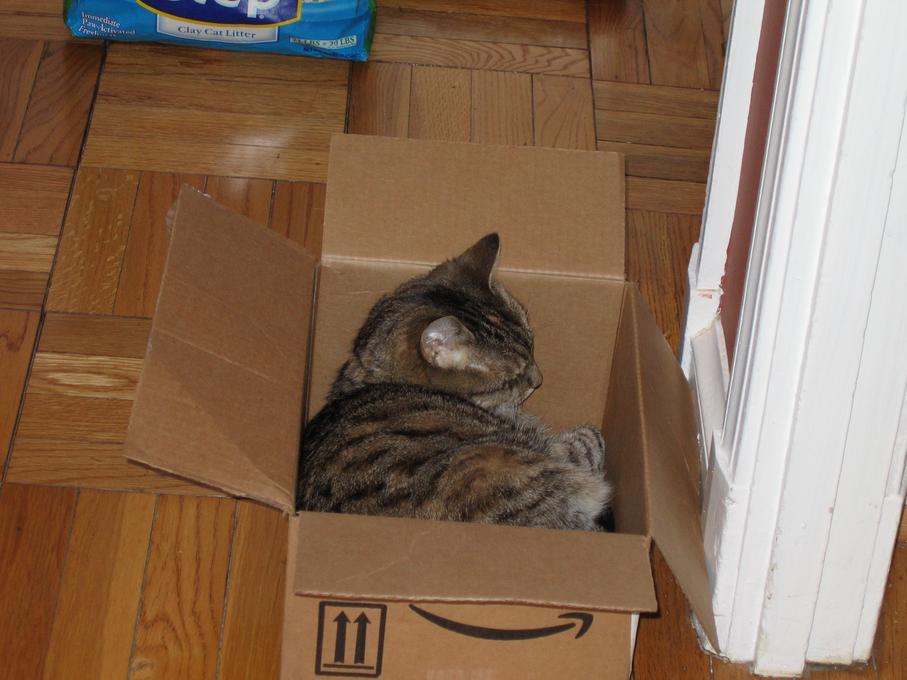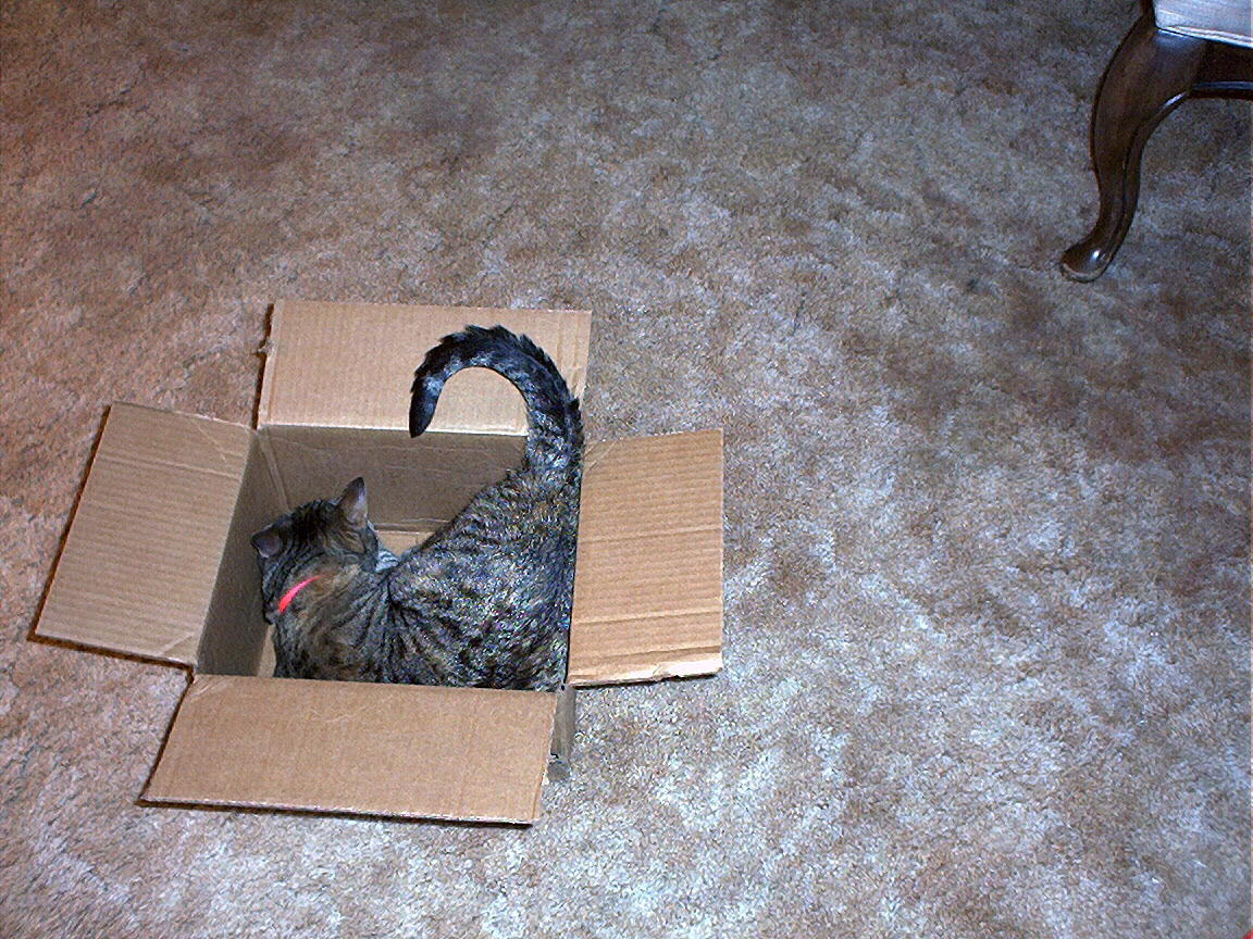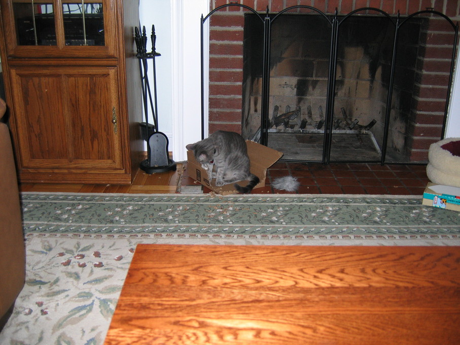 Electra sticking her paw into her box