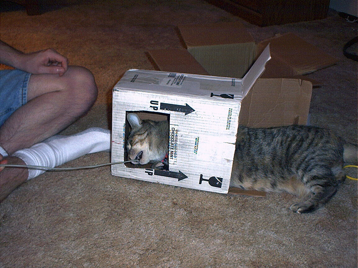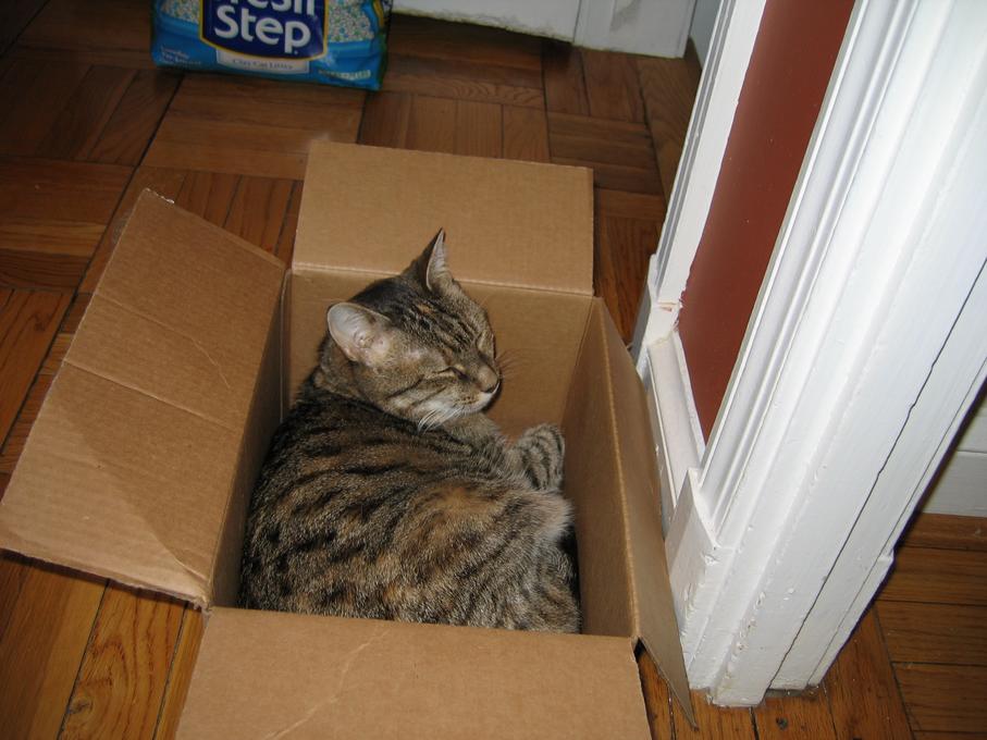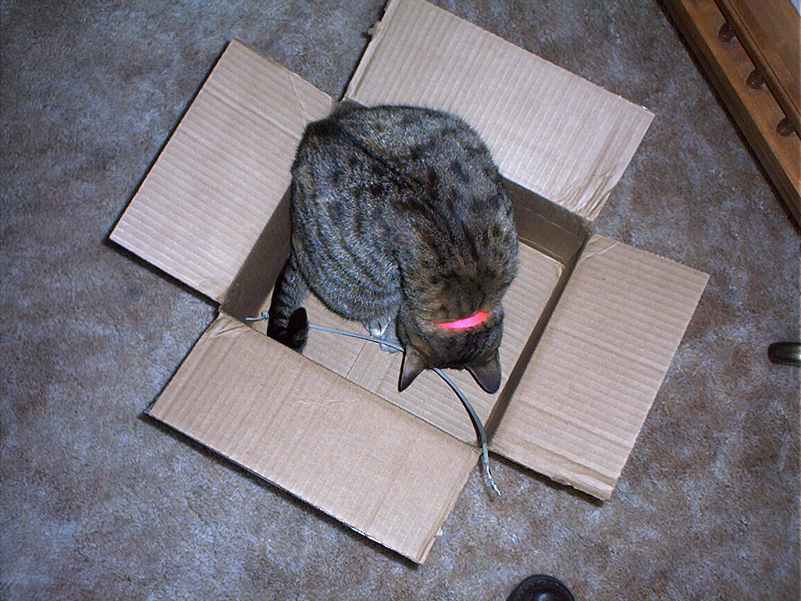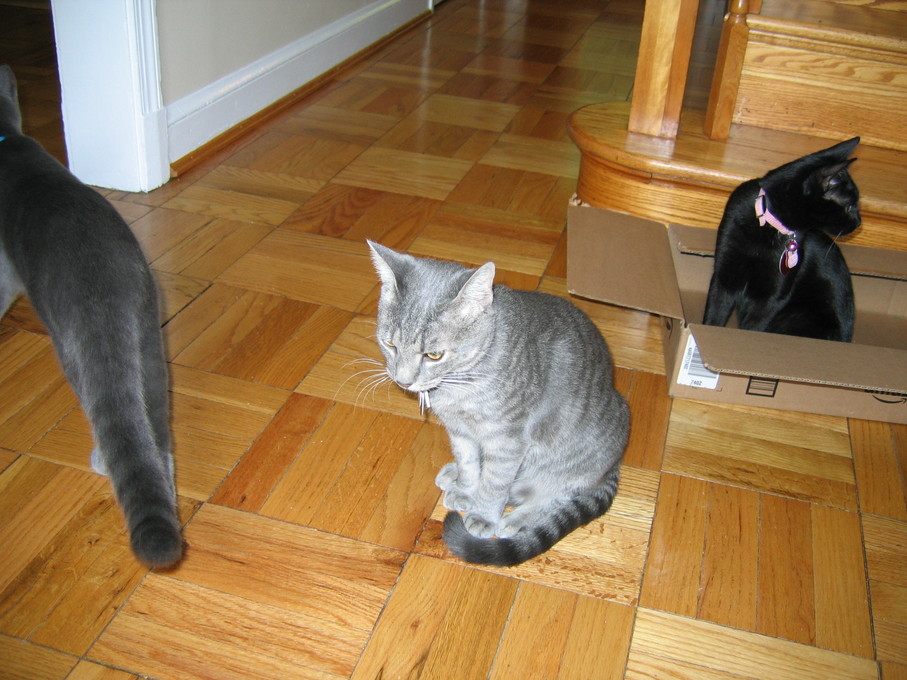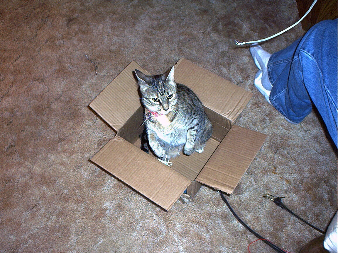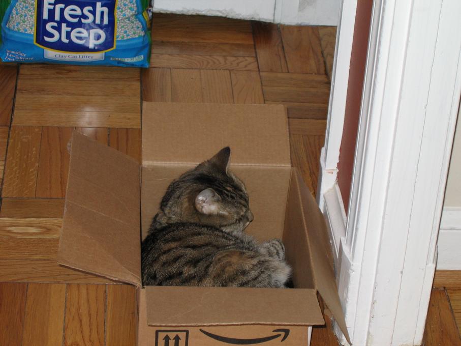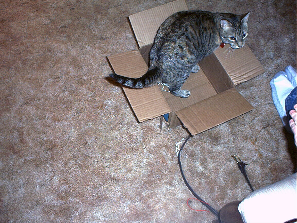 Electra sticking her paw into her box