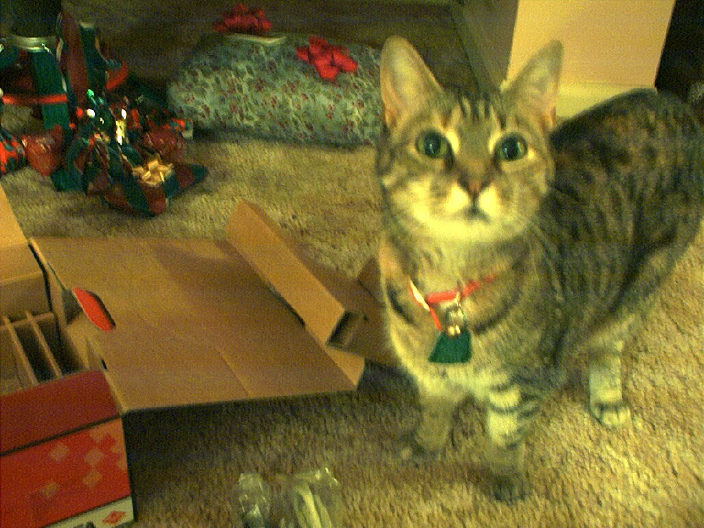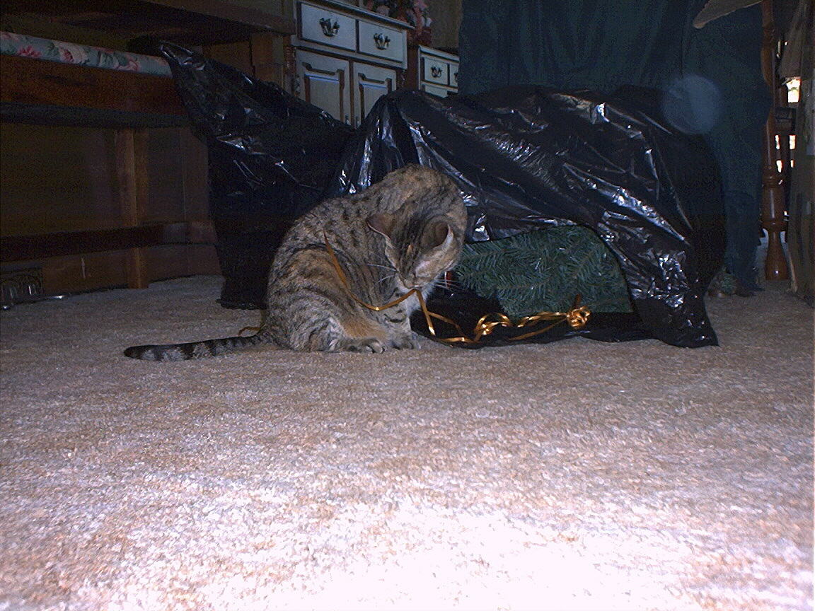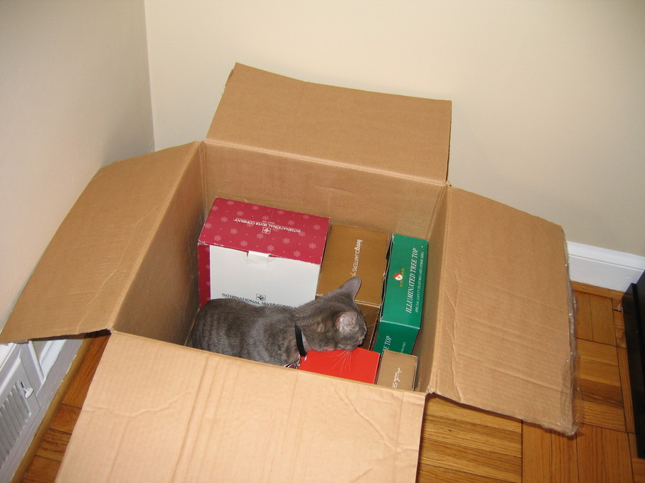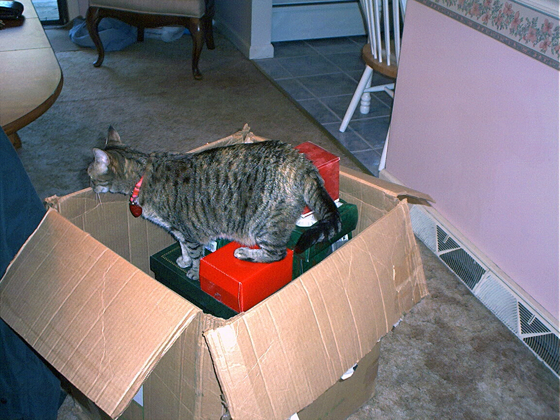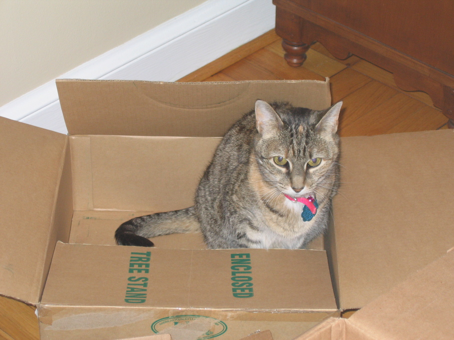 Electra in the Christmas tree stand box.