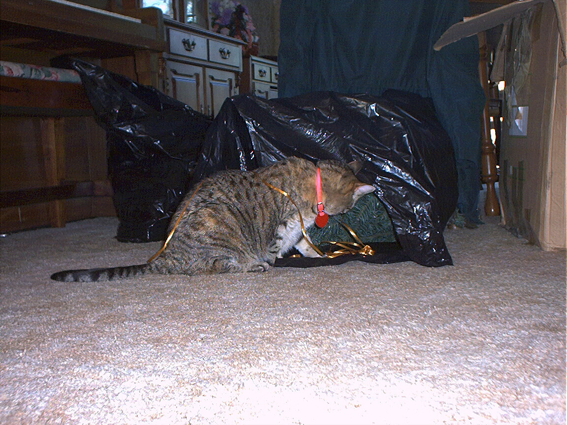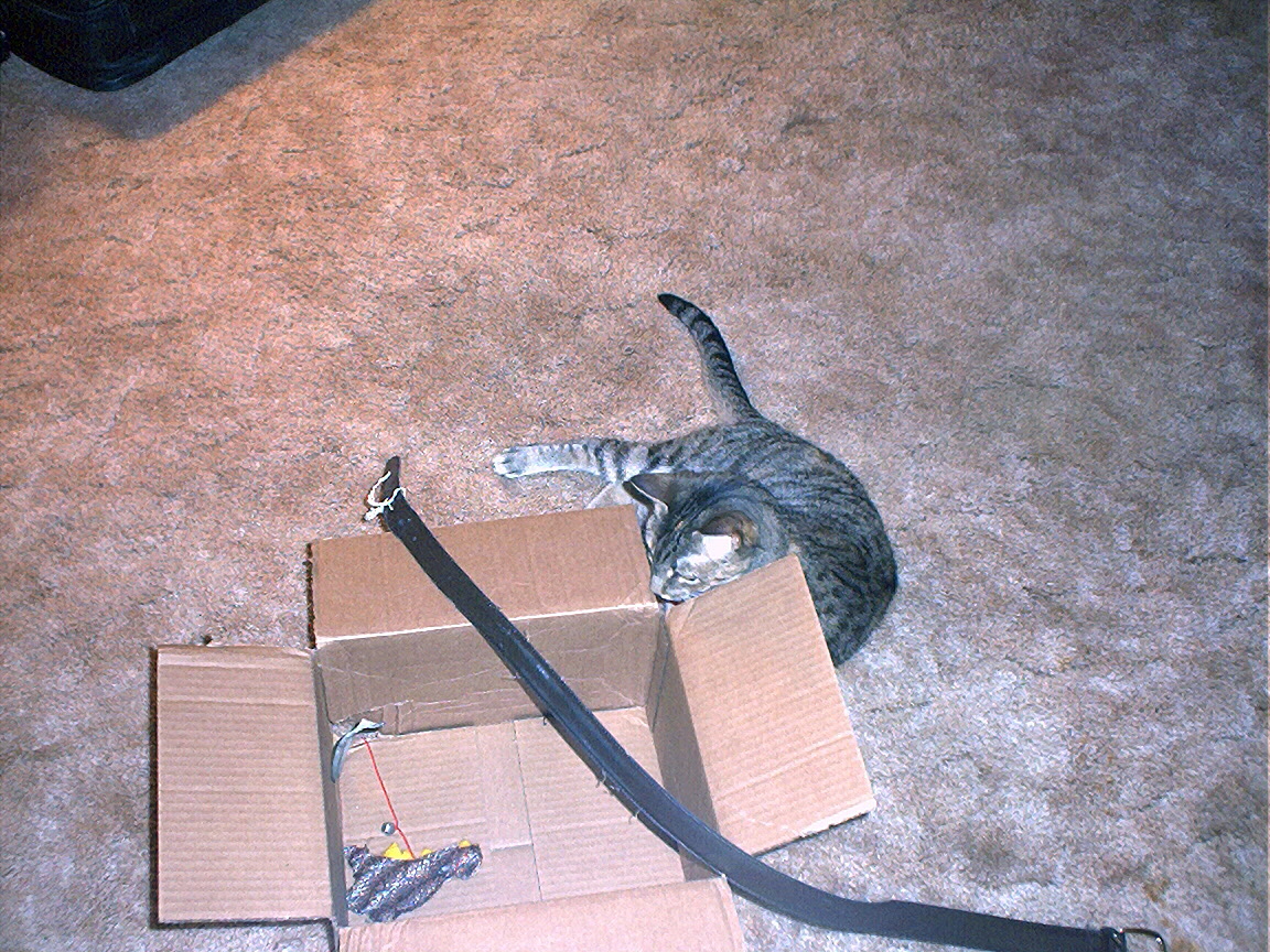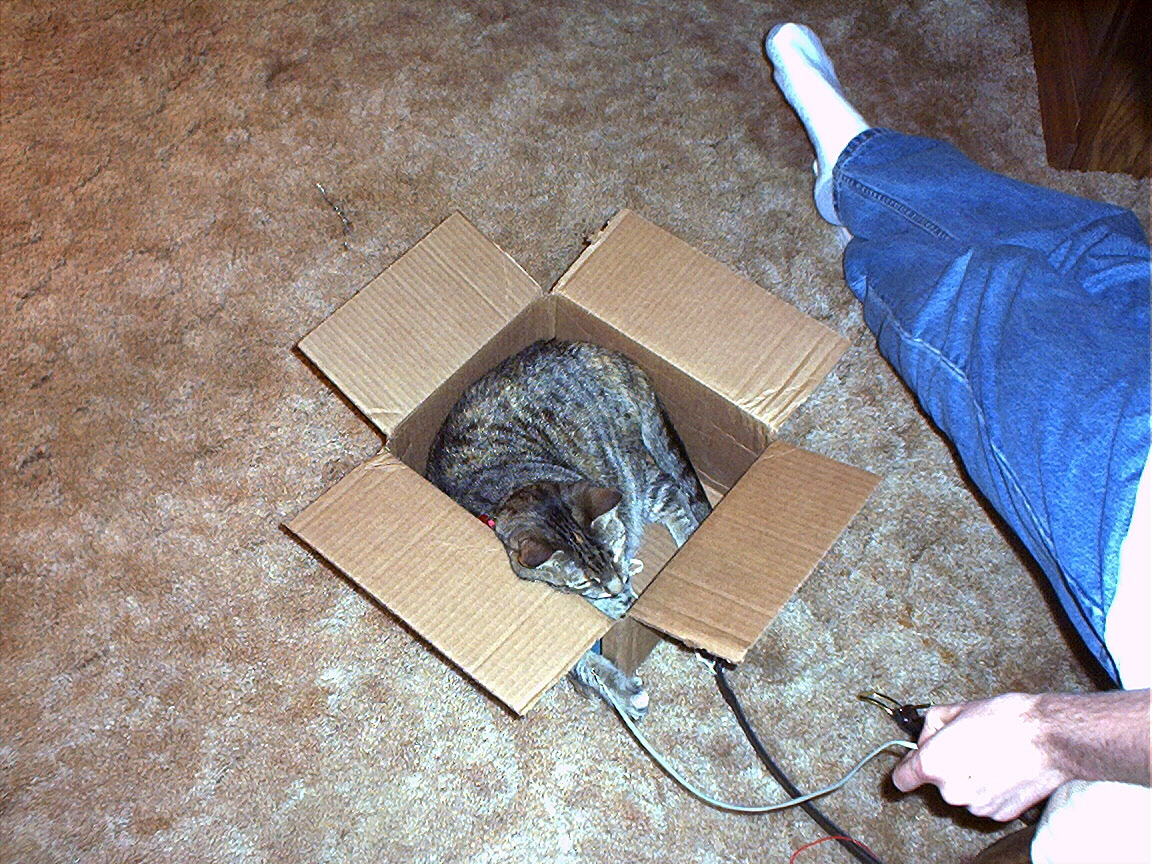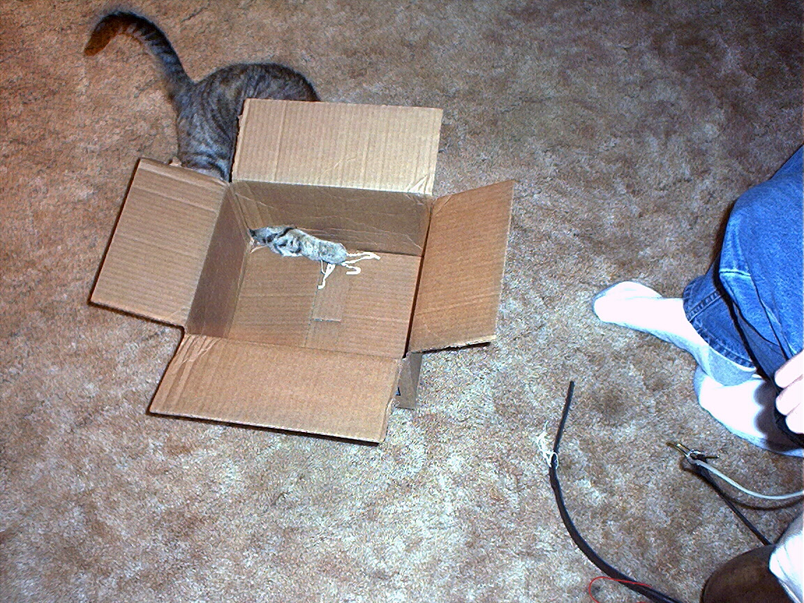 Electra in the Christmas tree stand box.