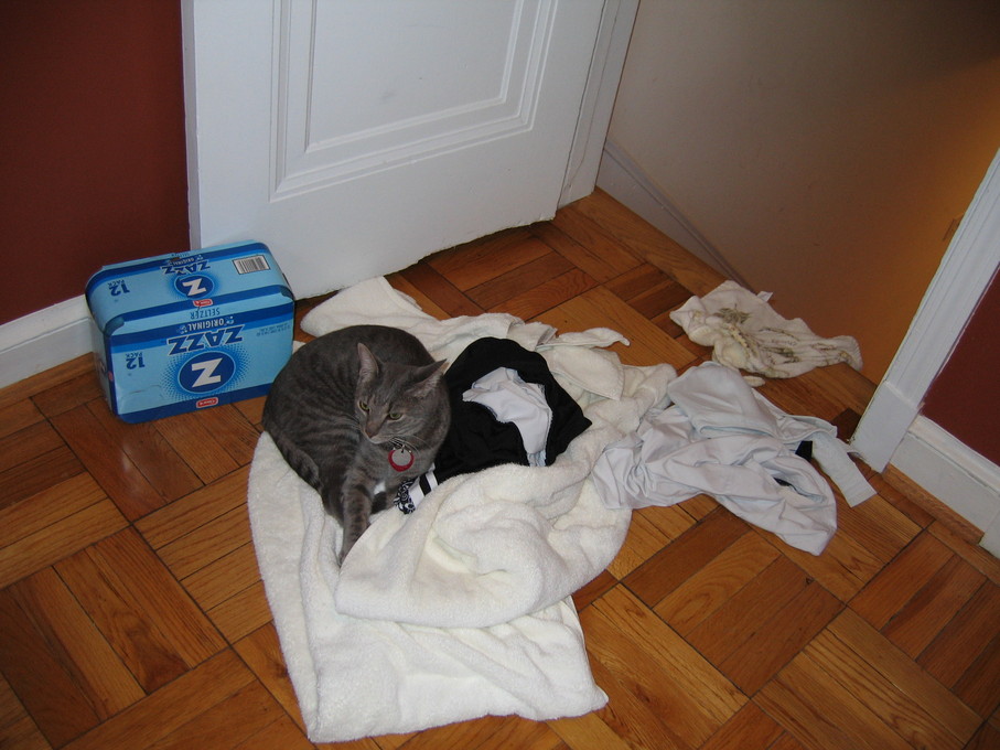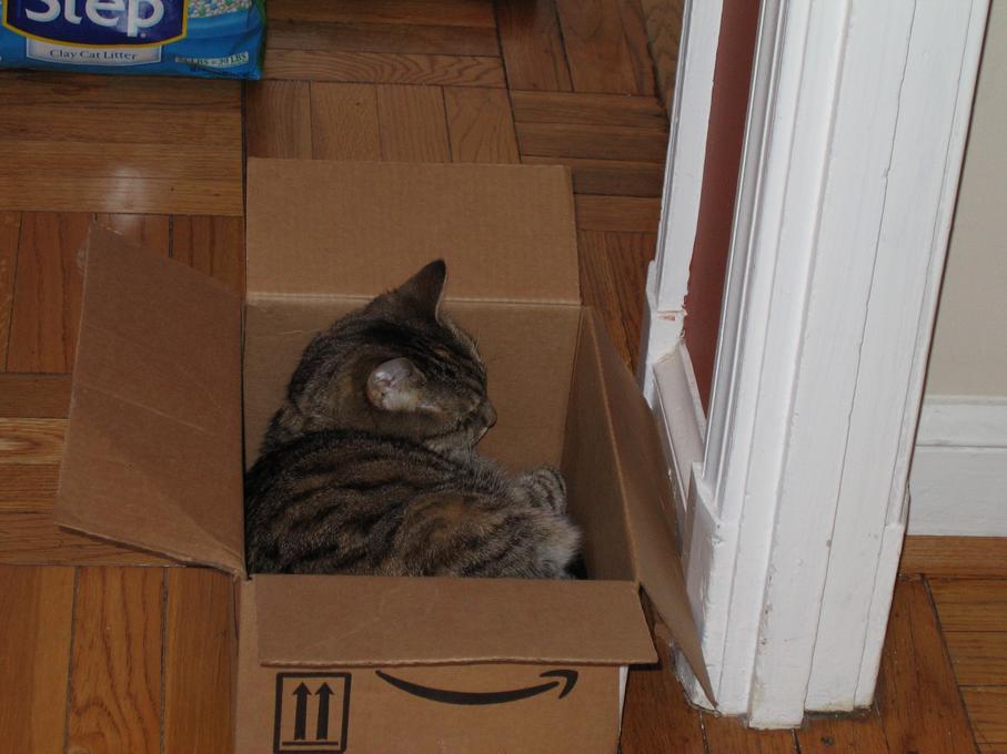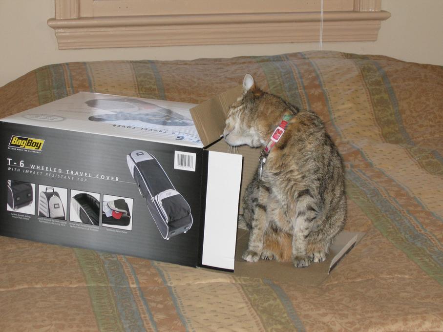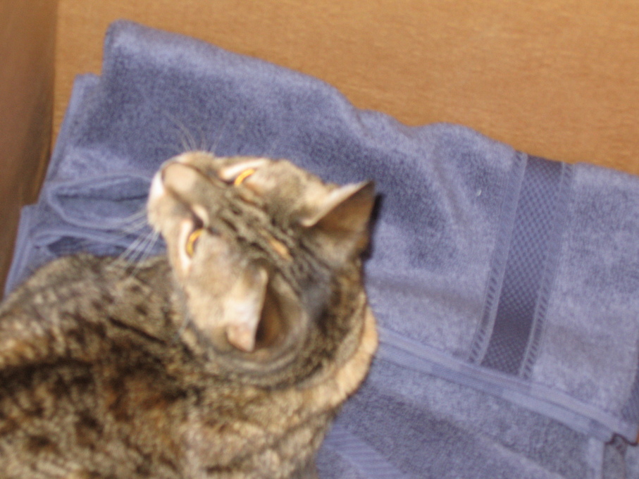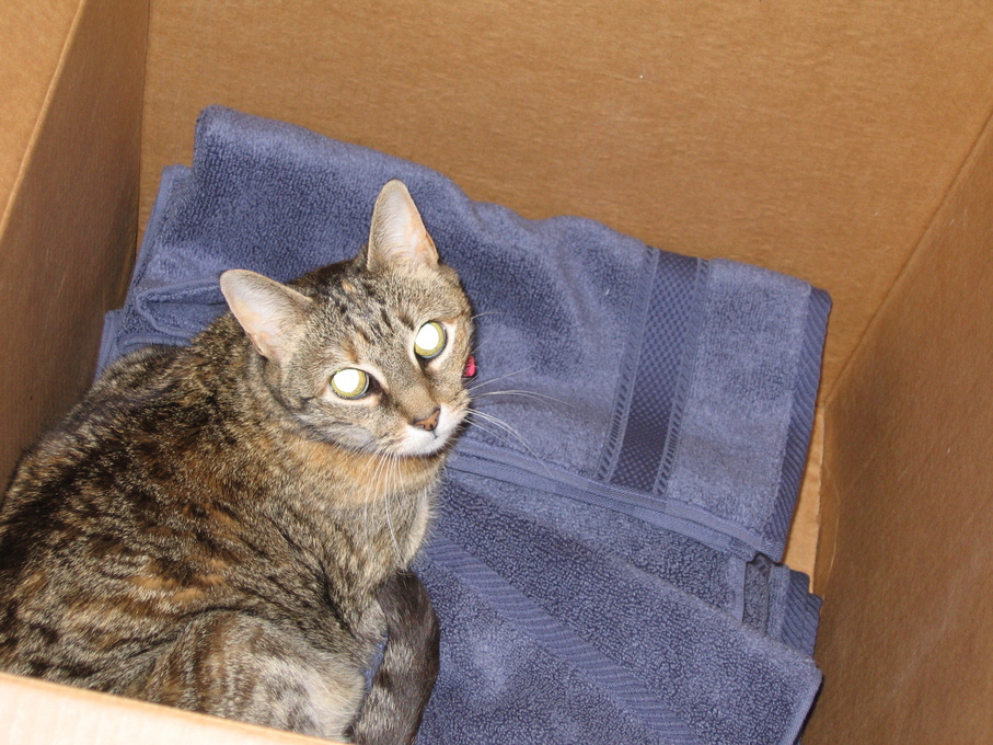 Electra in the box of towels I'm trying to wrap.