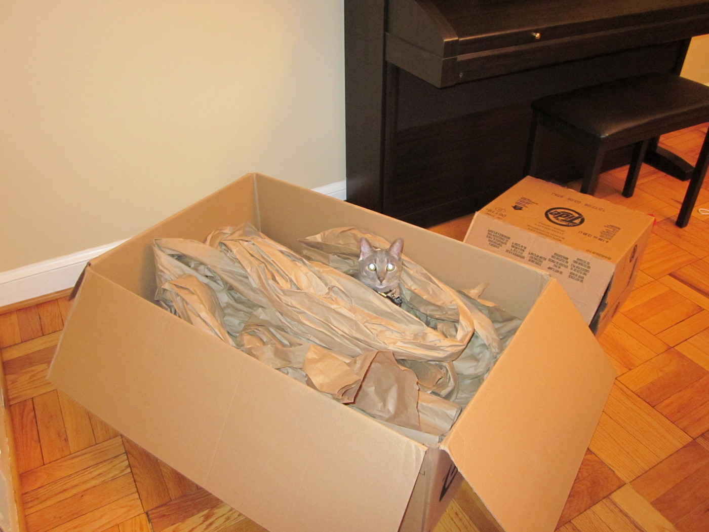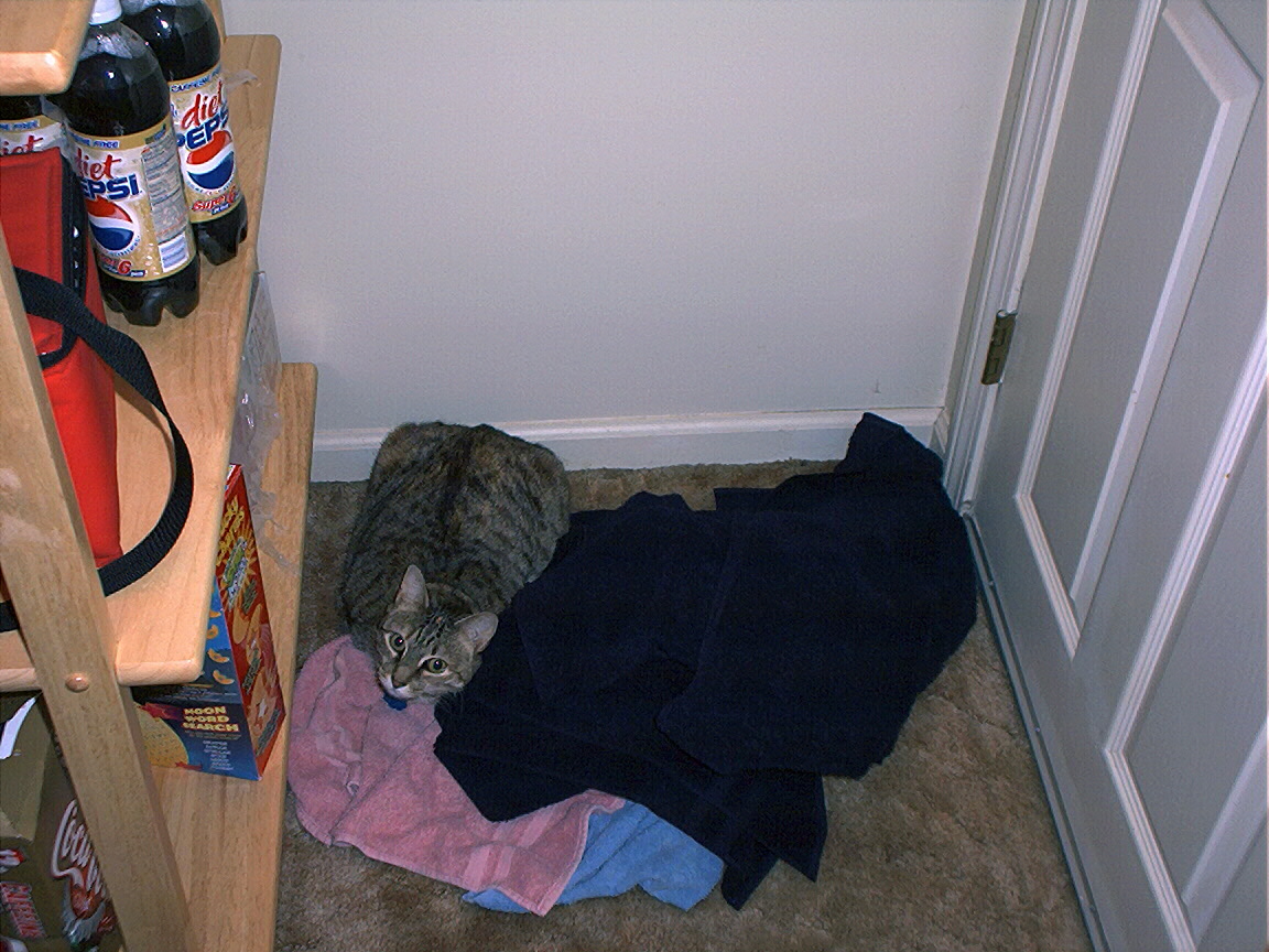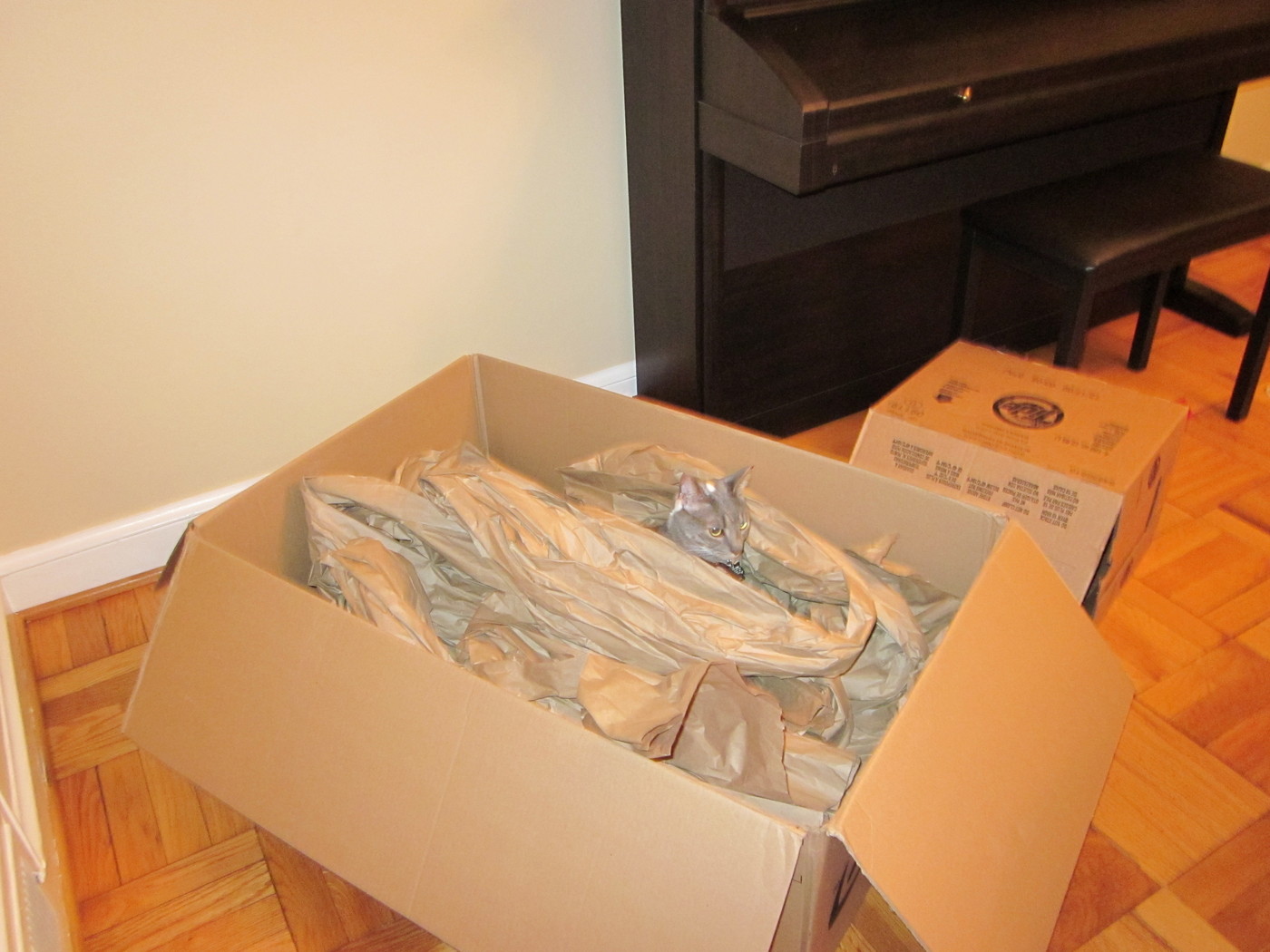 Electra in the box of towels I'm trying to wrap.