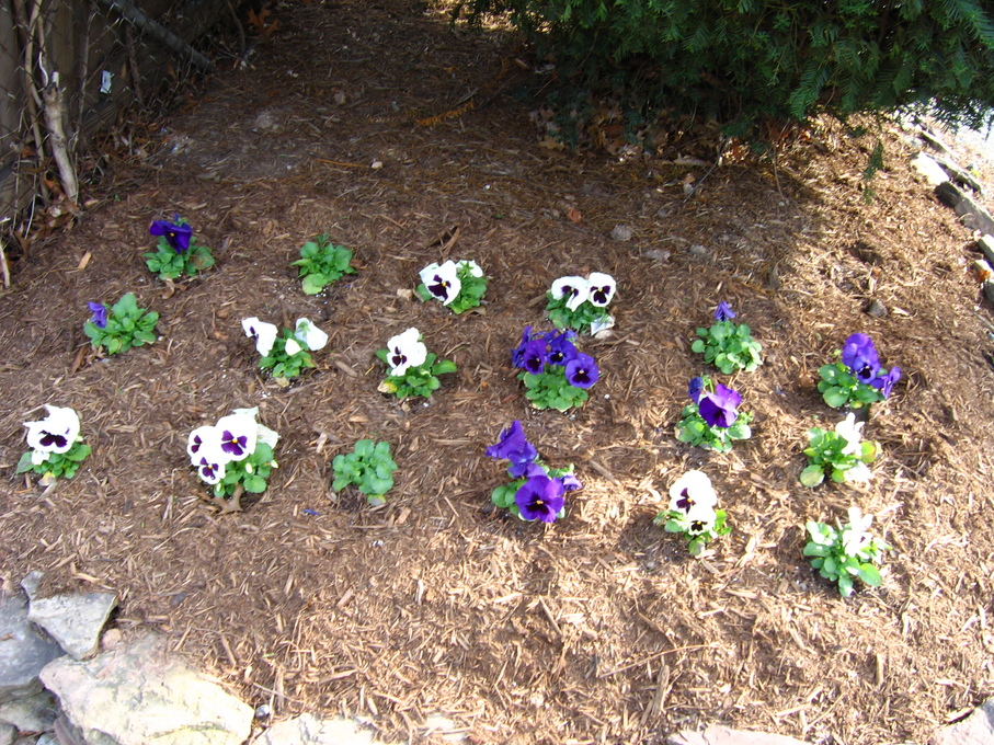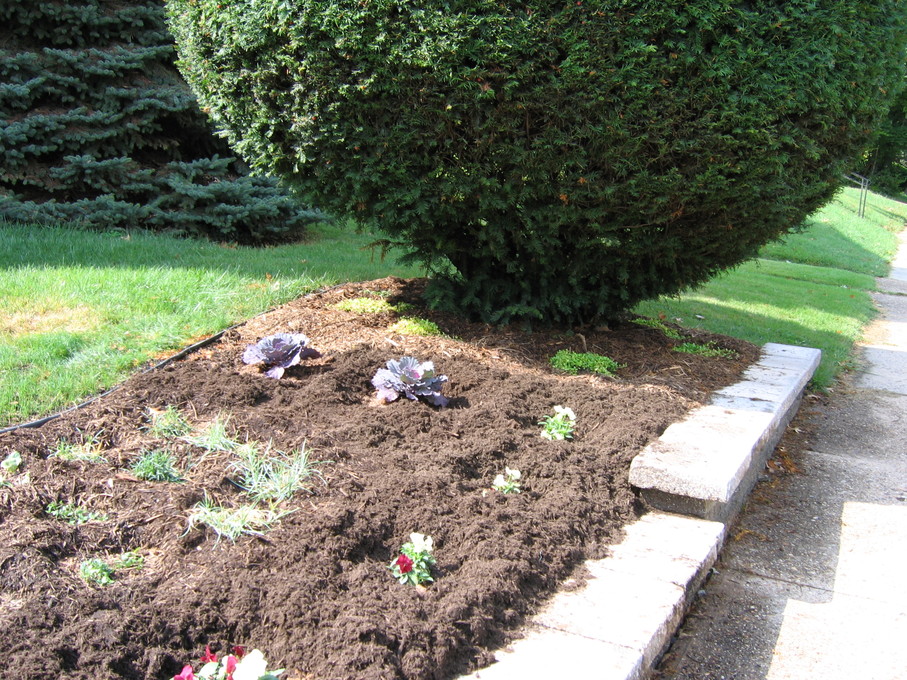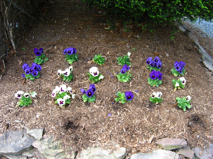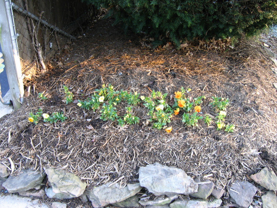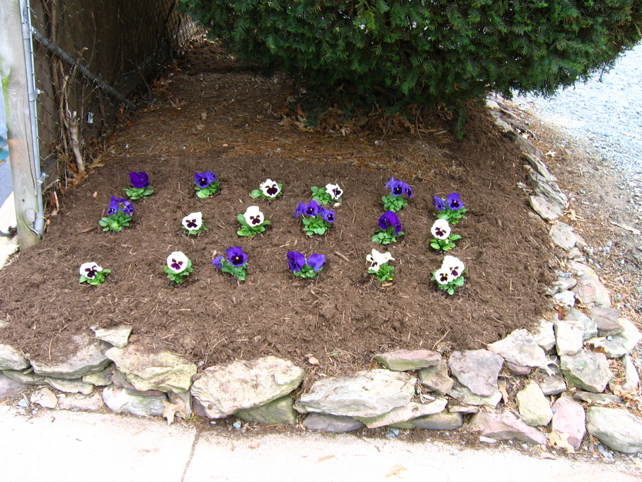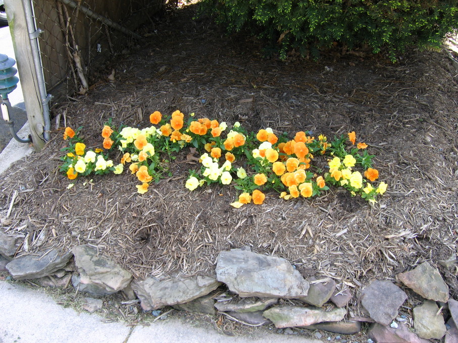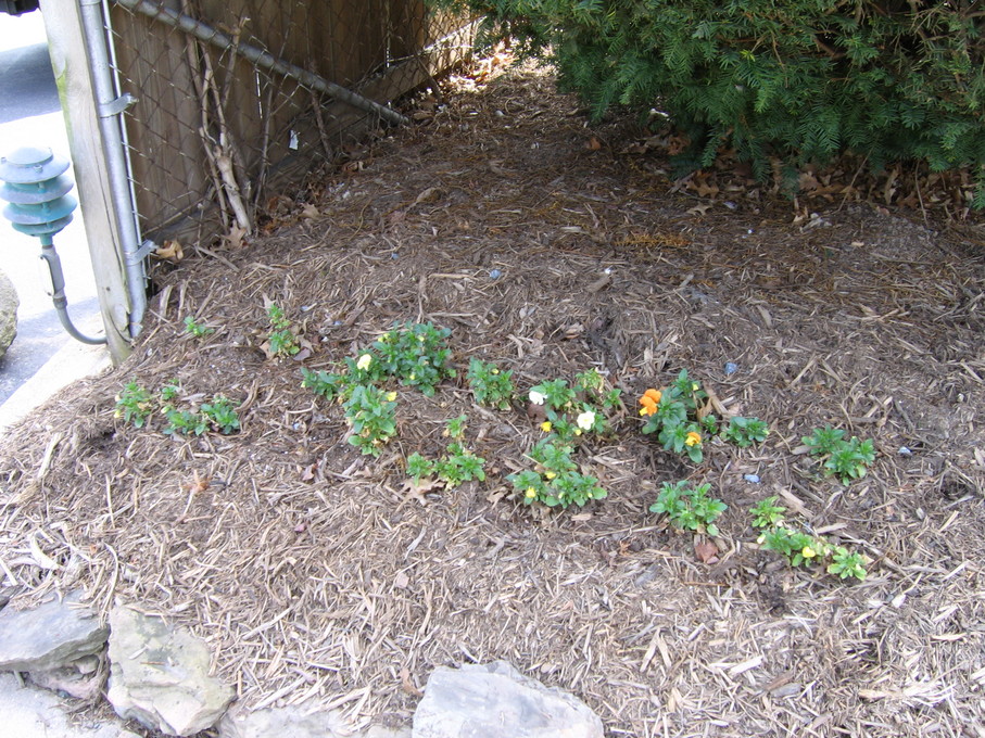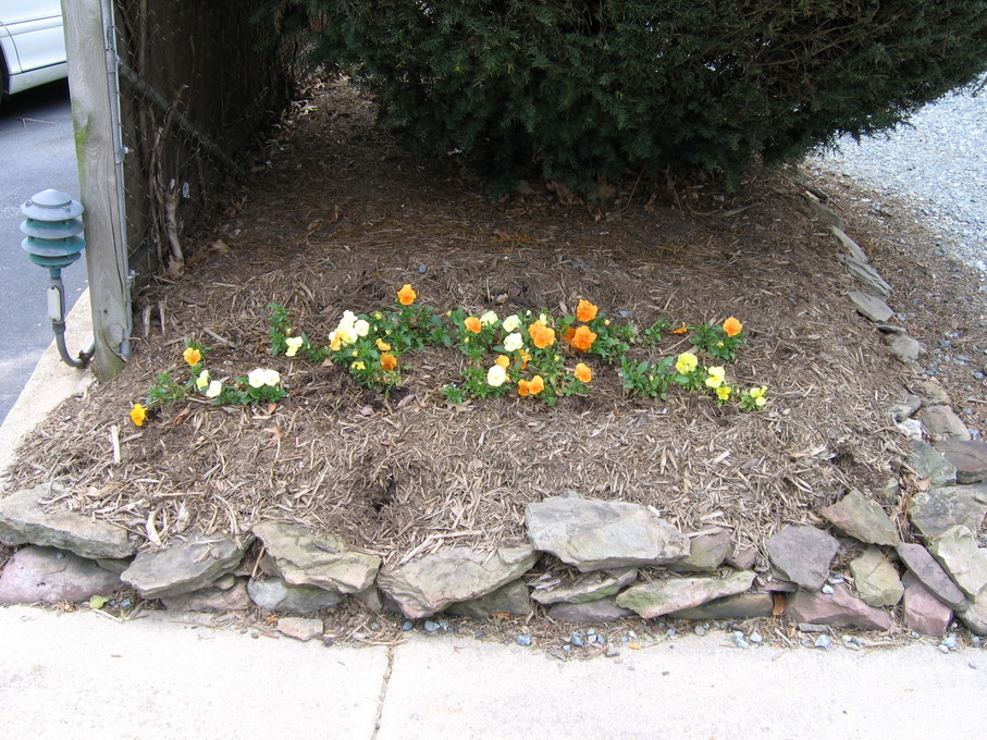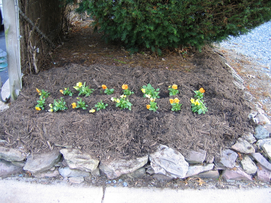 Pansies in front of evergreen bush at end of driveway.