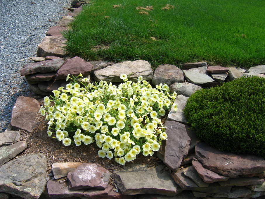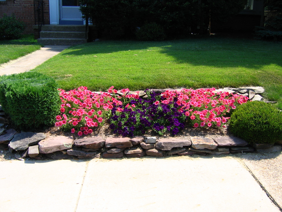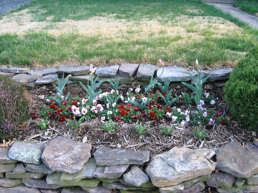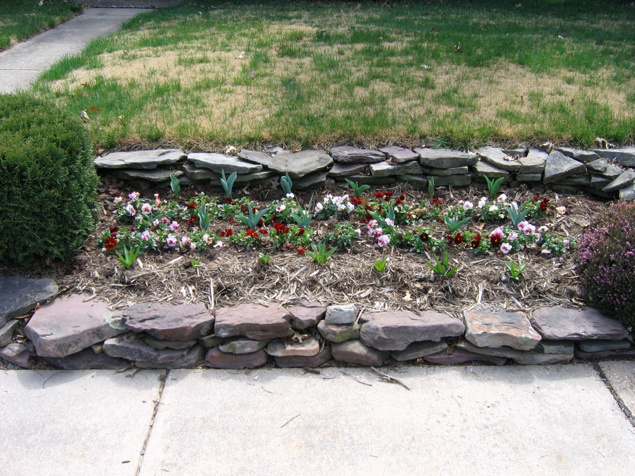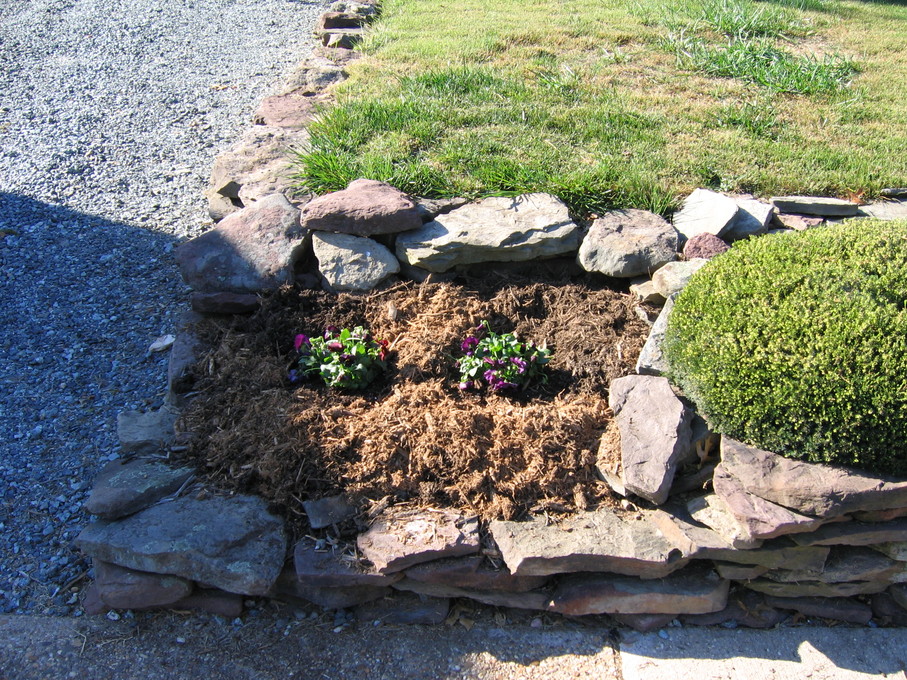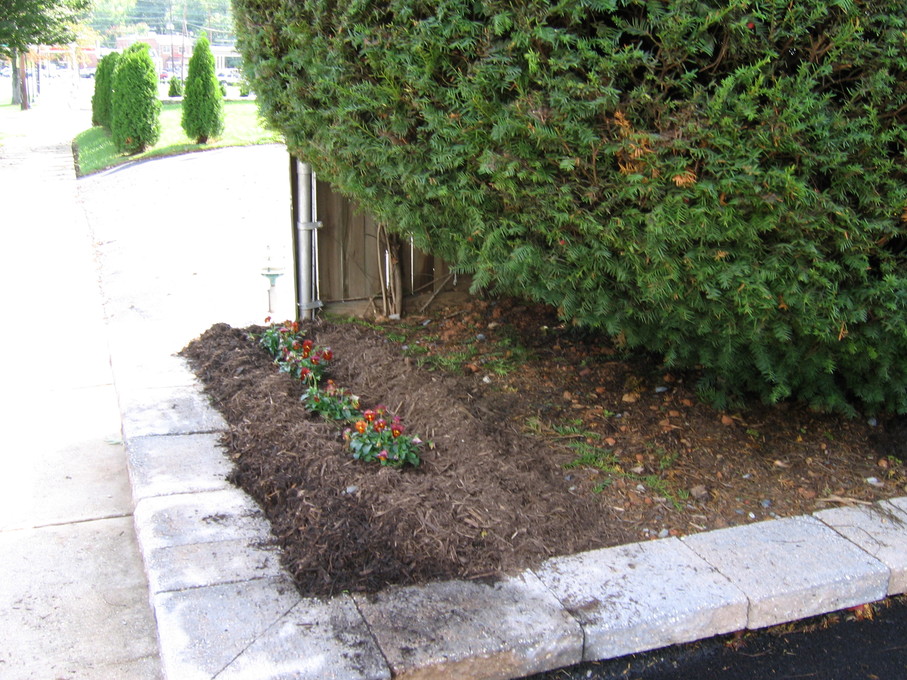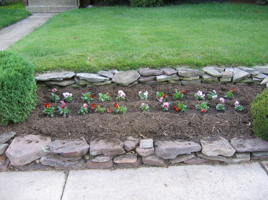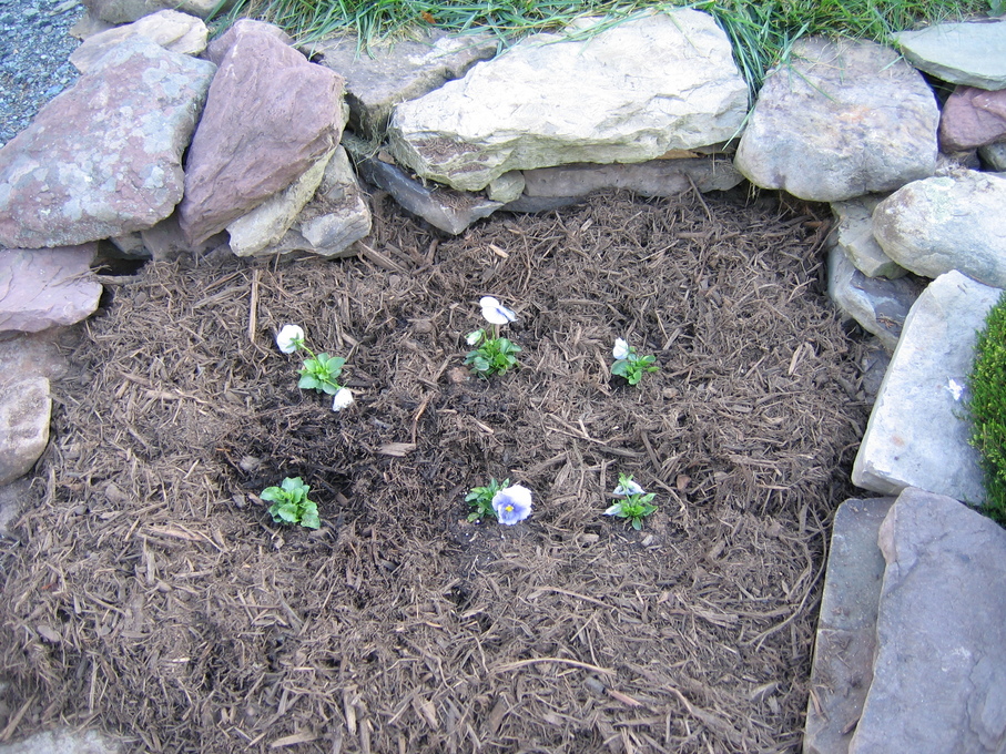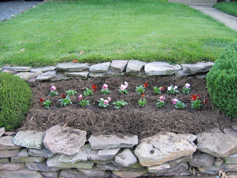 Pansies in front of evergreen bush at end of driveway.