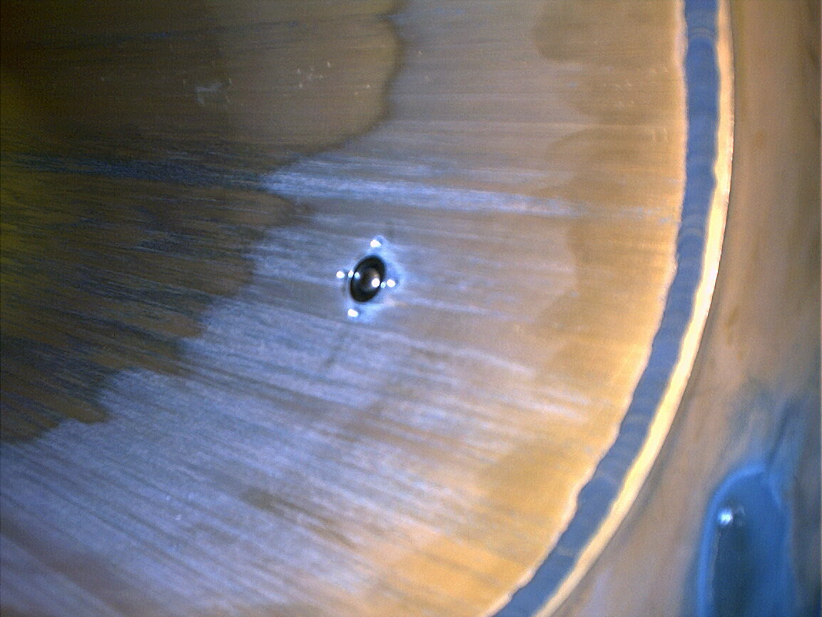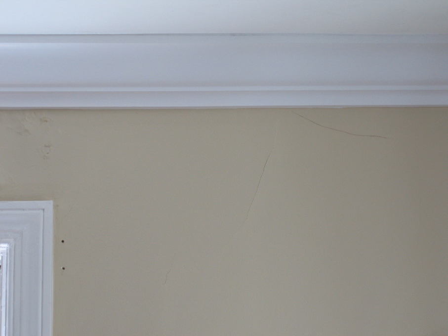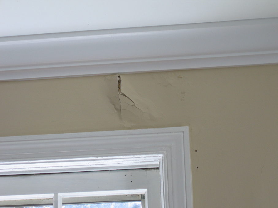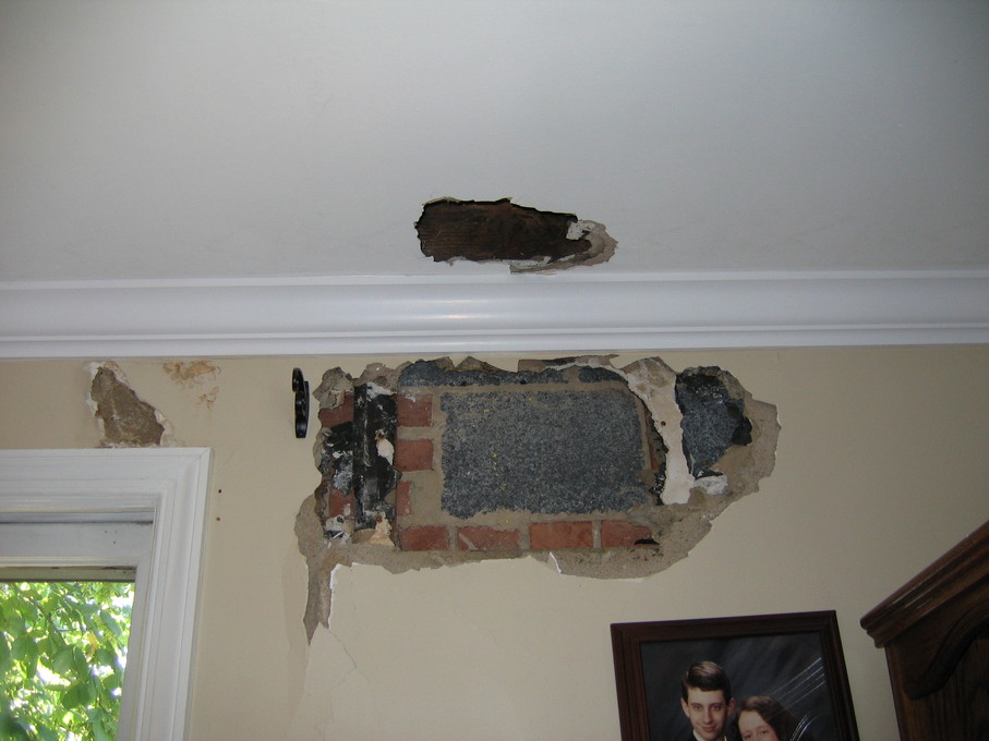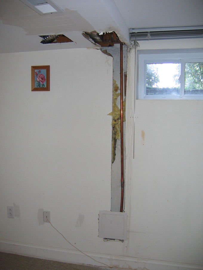 Hole in the living room wall after the leak was repaired. Hole in the basement wall after a leak was repaired.