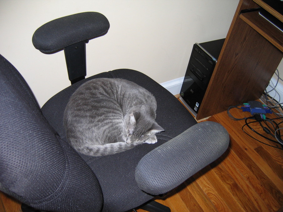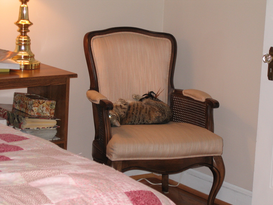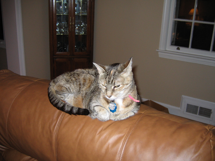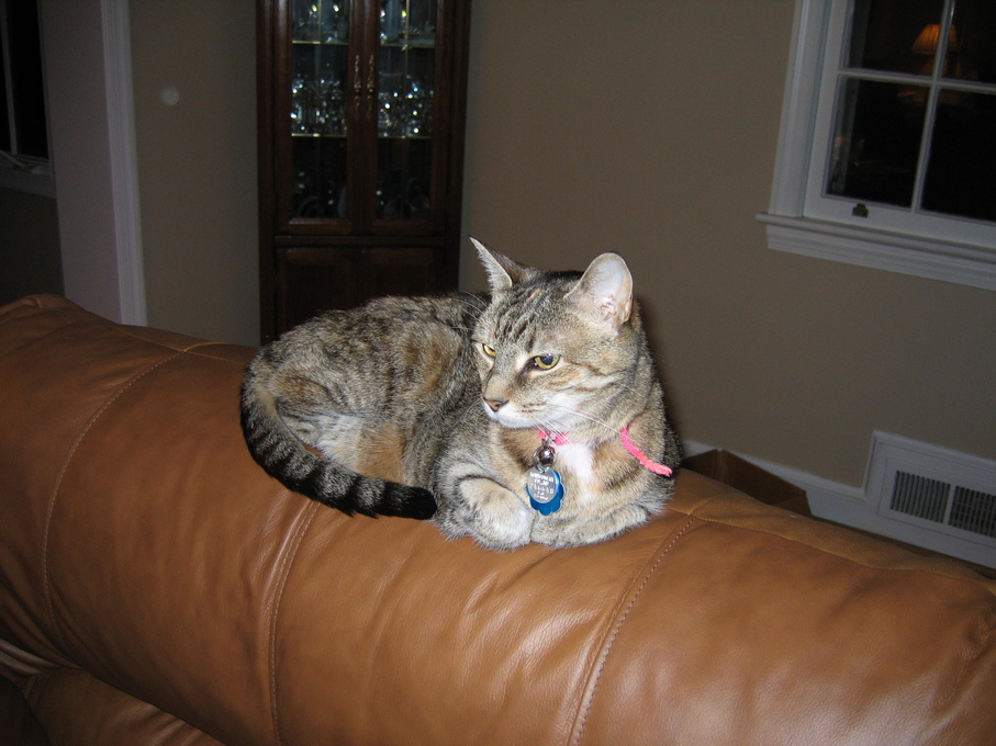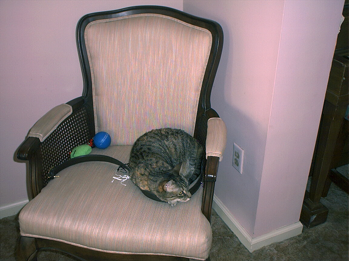 Electra sitting on the back of the chair.