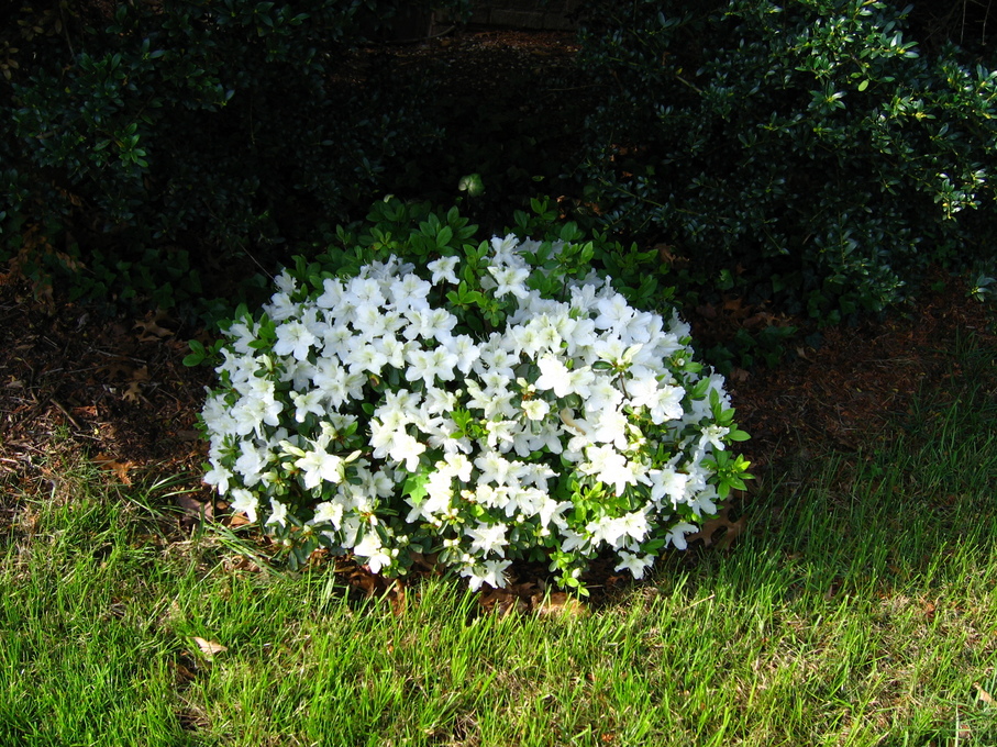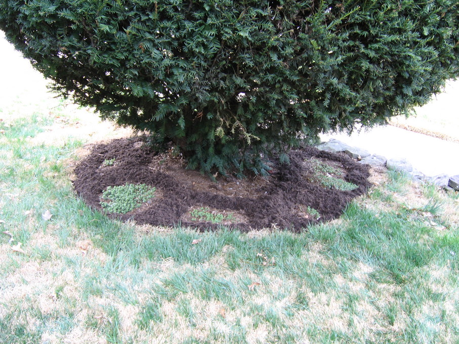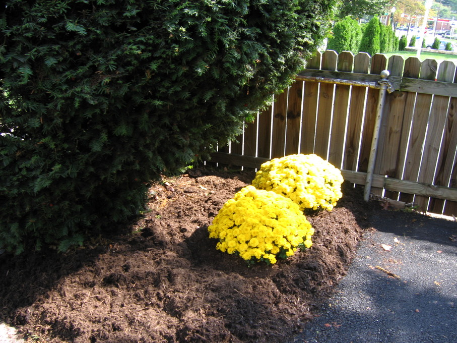 Crysanthemums behind evergreen bush at end of driveway.