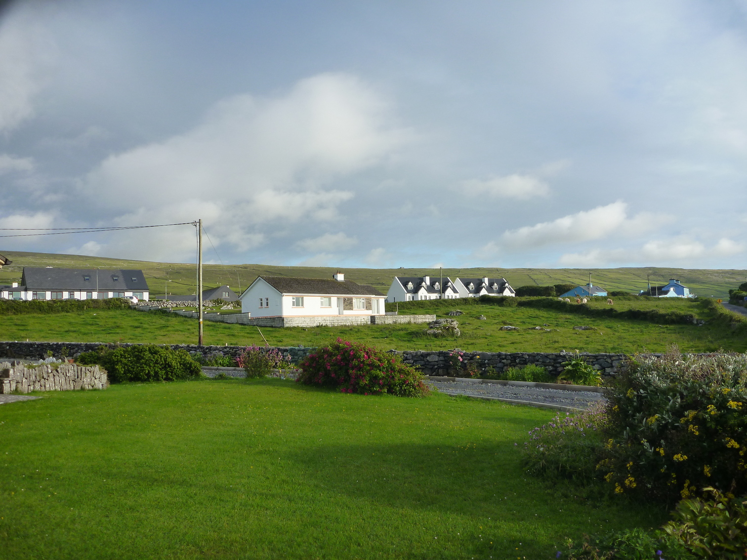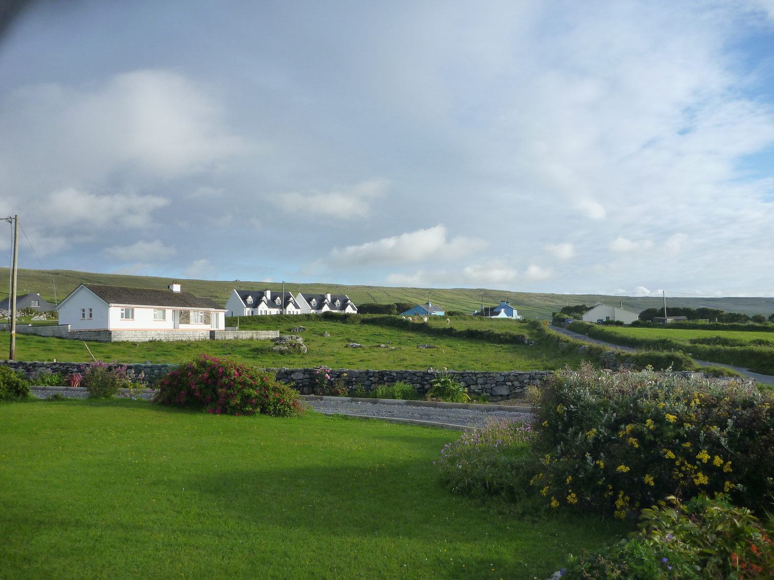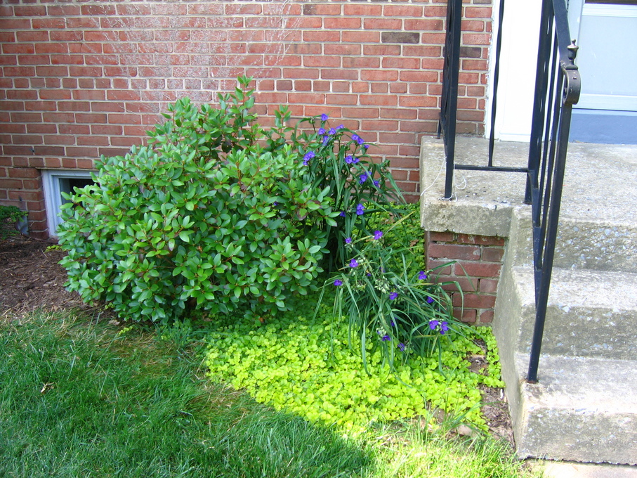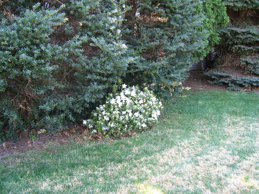 Side of front yard away from driveway, with crysanthemum.