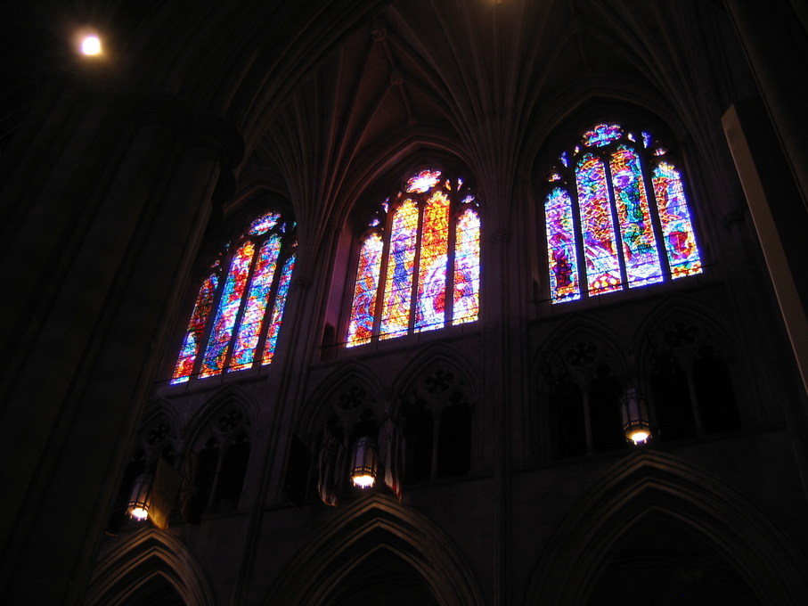 Stained glass windows inside Washington National Cathedral.