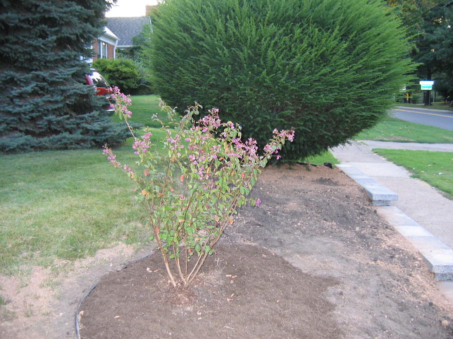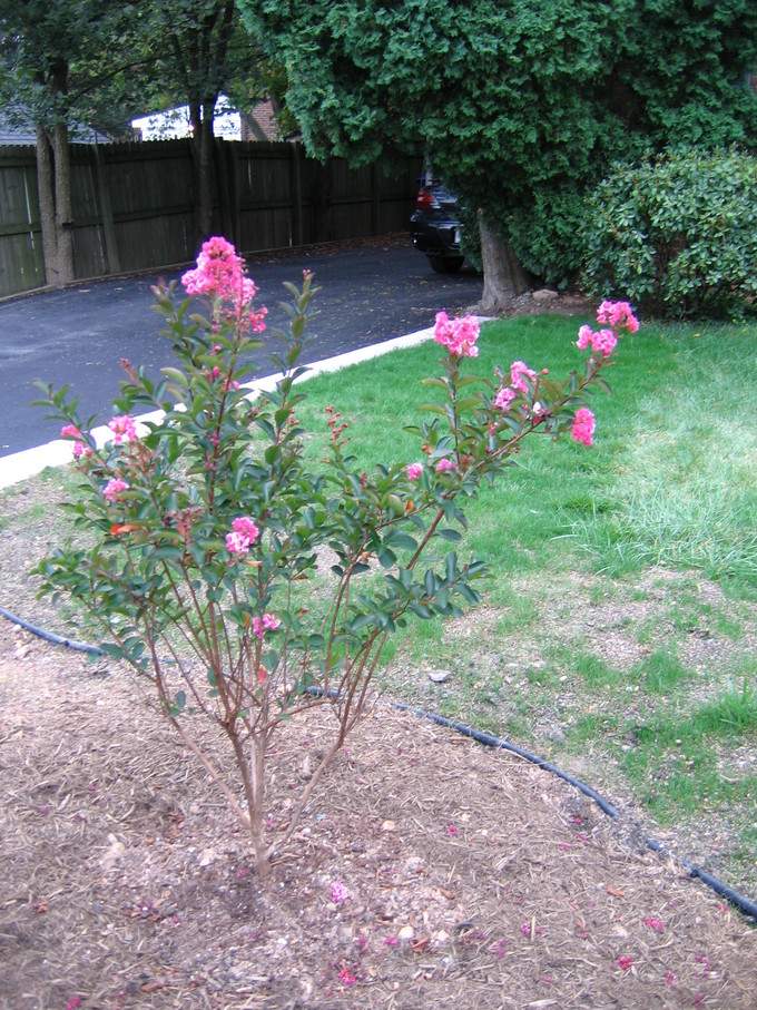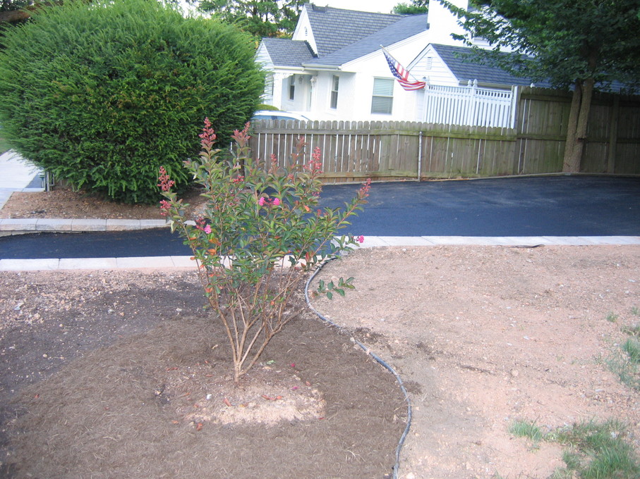 Front yard with 'brown summit' Crape Myrtle and new euonymus shrub.