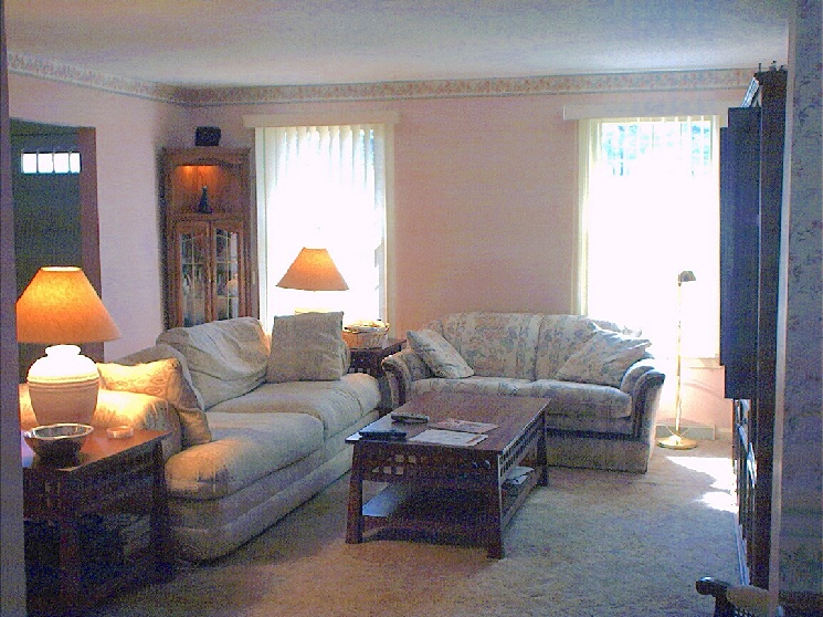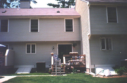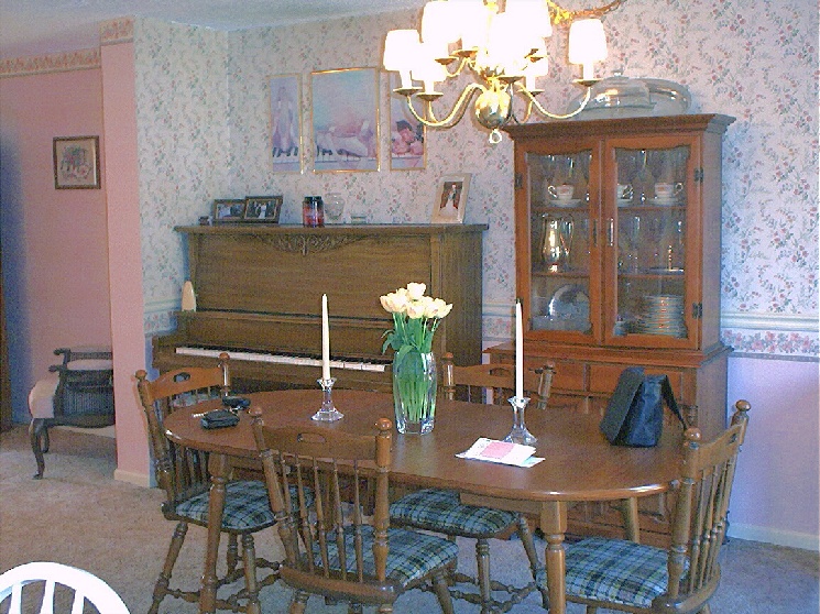 First, there is a picture of the front of the condo - we are the center condo pictured. Then we go inside and look at the dining room from the kitchen. Next we look at the kitchen from the dining room (We had the kitchen remodeled; here's a before picture.). Finally we turn back the way we came in and look at the living room from the dining room.