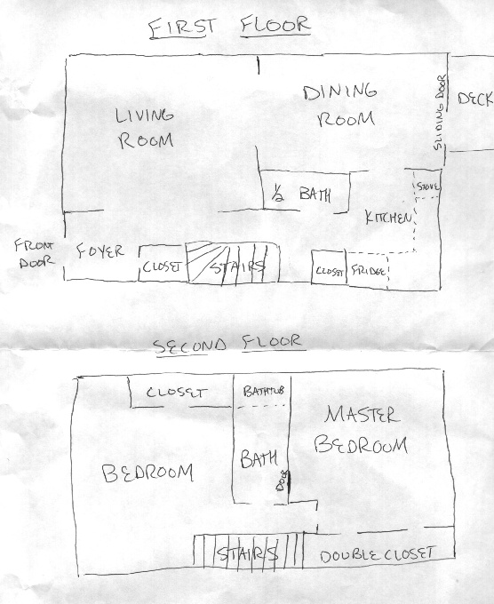 I've scanned in a bunch of pictures of the condo, mostly from February 2001. But first I have a floor plan so that you can tell where things are (Yeah, yeah, I drew it by hand).