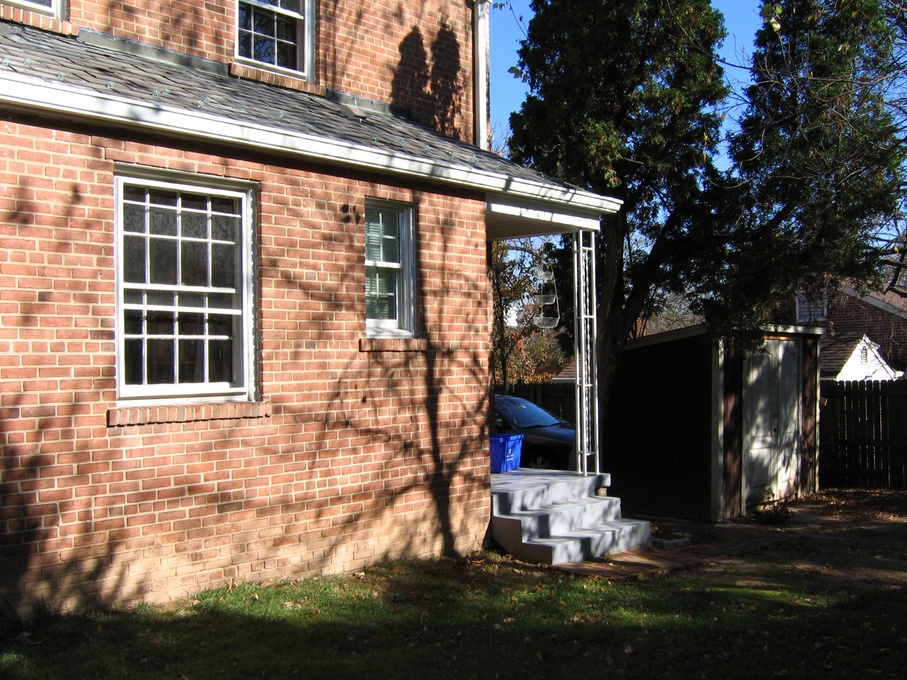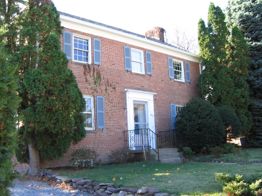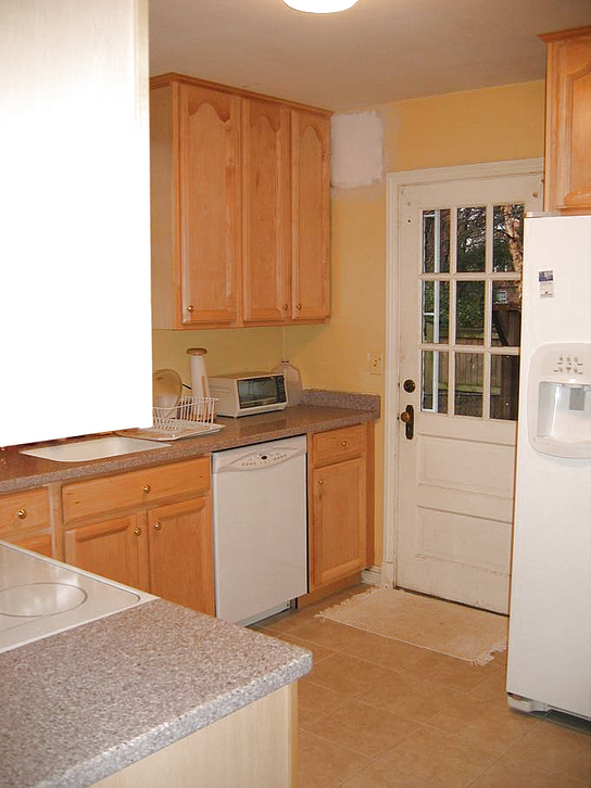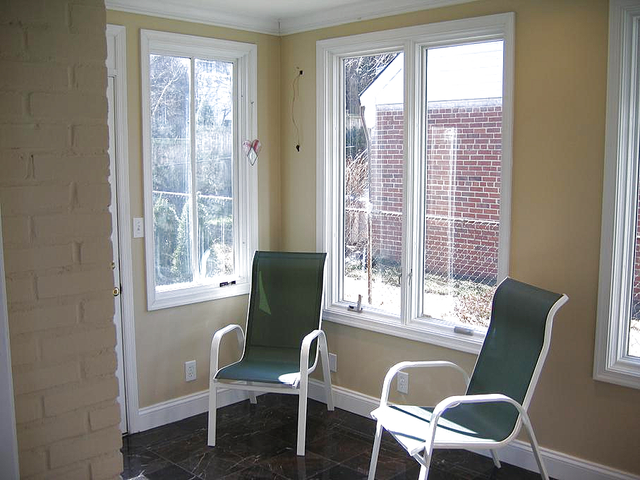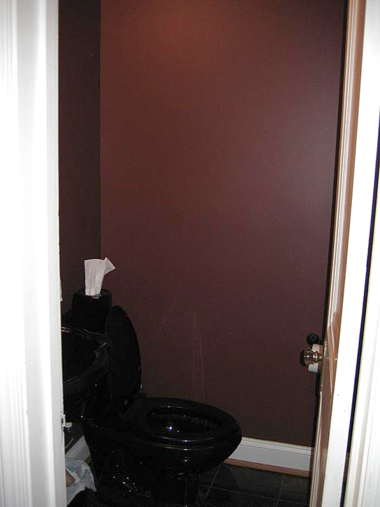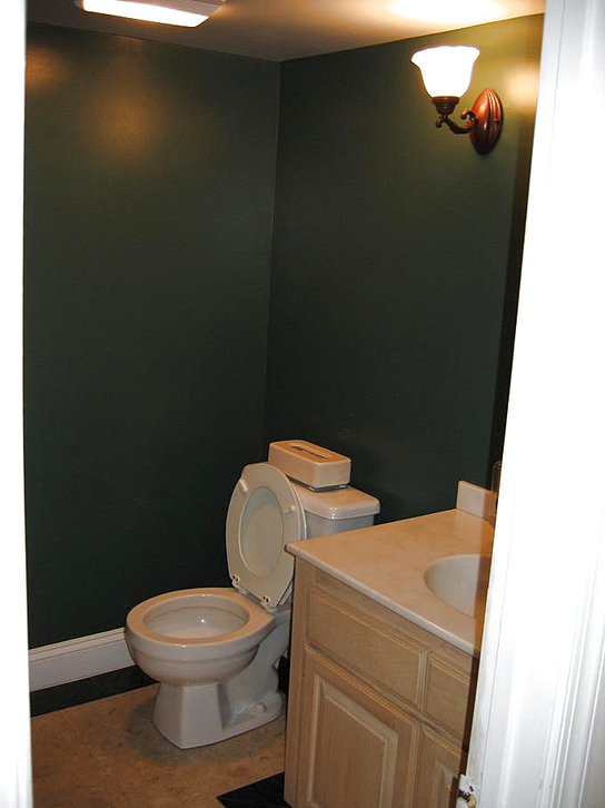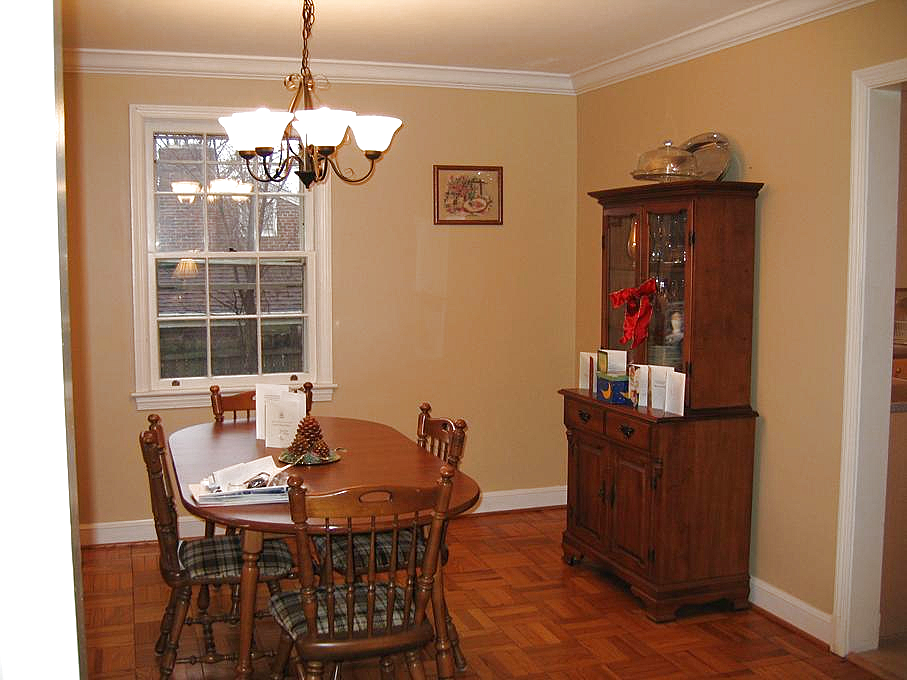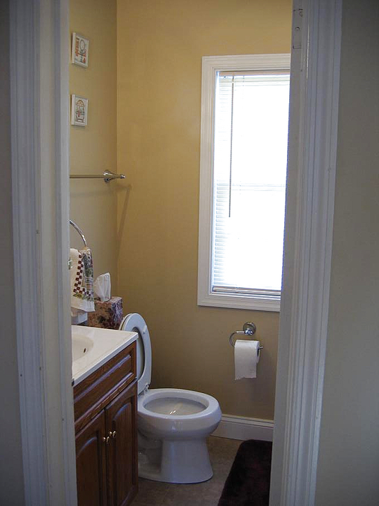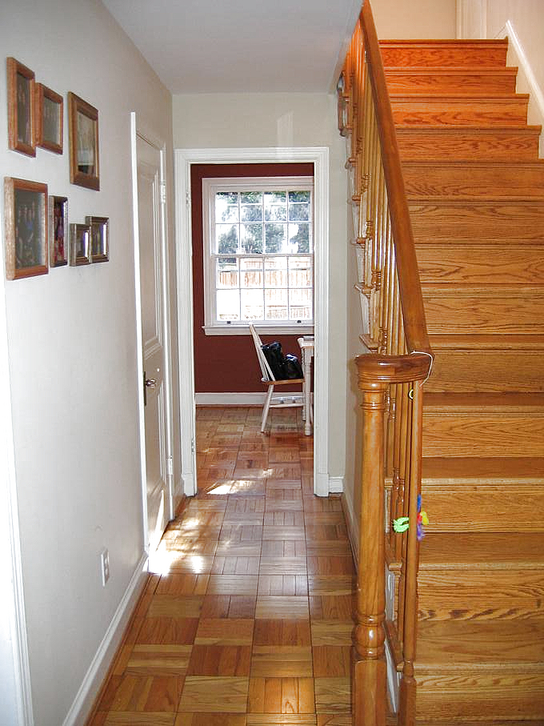 Going through the kitchen to the breakfast room, we can peek at the powder room, the half-bathroom on the first floor. Turning around, we can look back down the hallway at the front door.