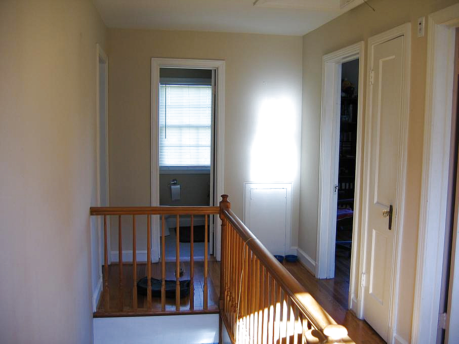 Now let's go back to the front door and head upstairs. At the top of the stairs, we can turn around and look down the upstairs hallway: the doors to the guest bedroom and computer room are on the right, the guest bathroom is at the far end, and the master bedroom is at the end to the left.