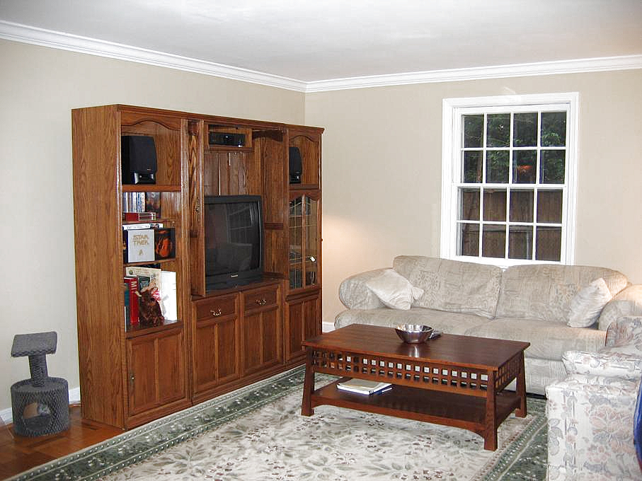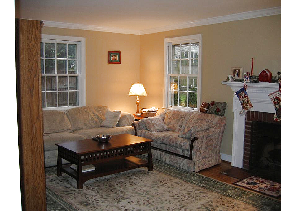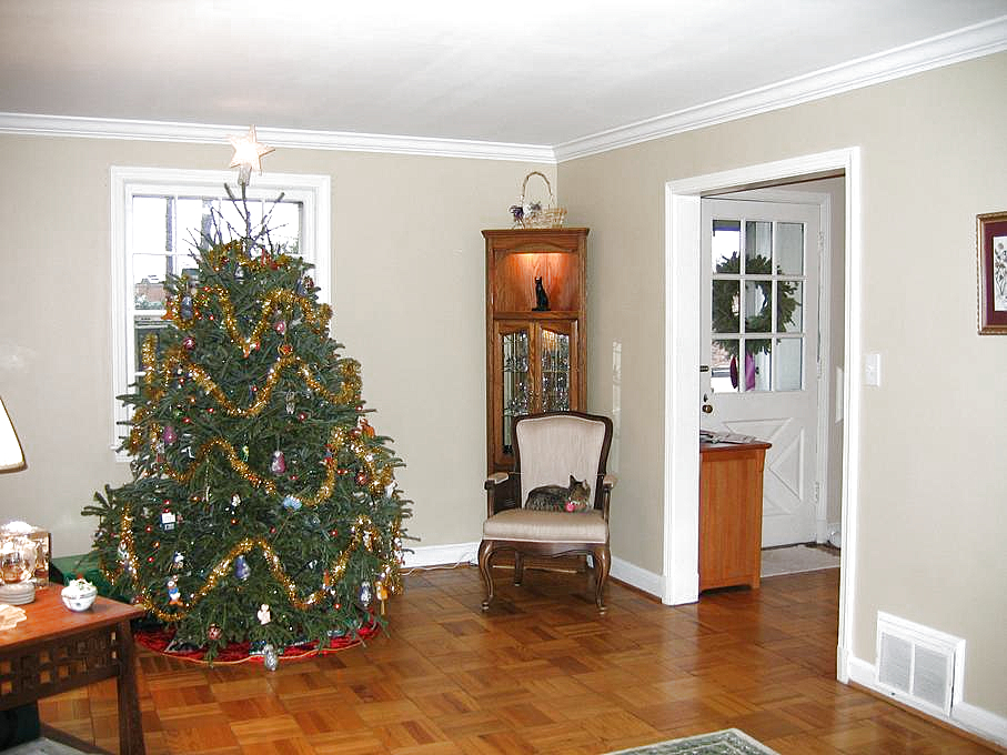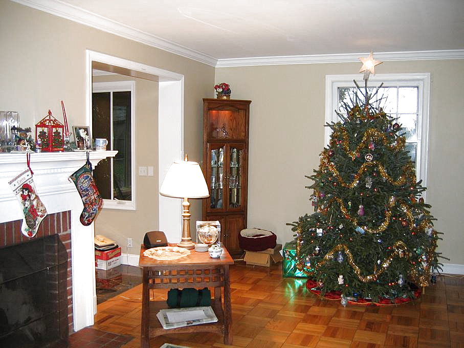 Now, the inside. Let's walk in the front door and look down the first floor hallway, toward the breakfast room. Let's turn to the right and look into the living room. If we enter the living room and look to the right of the fireplace, we see the front of the living room and the Christmas tree; the entrance to the alcove is in between. If we turn right a little more, we can see the entrance to the living room and the foyer. If we turn right again, we can see the entertainment center in the living room. Traveling through the living room, we can look at the alcove.