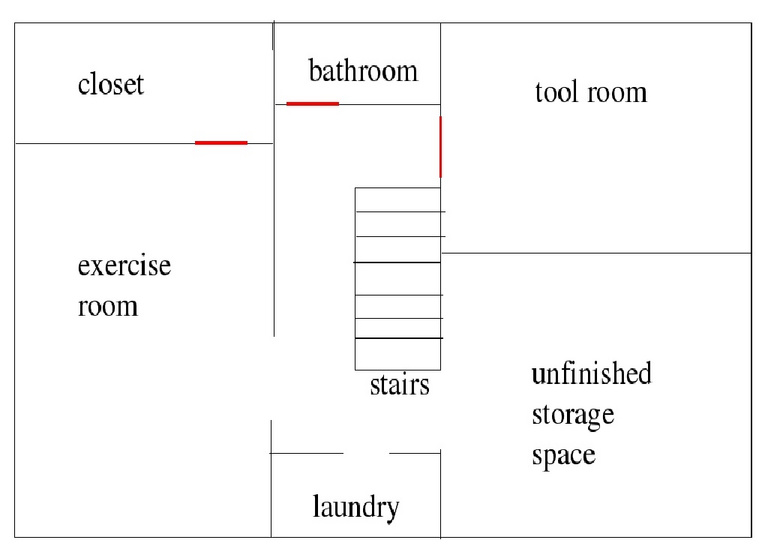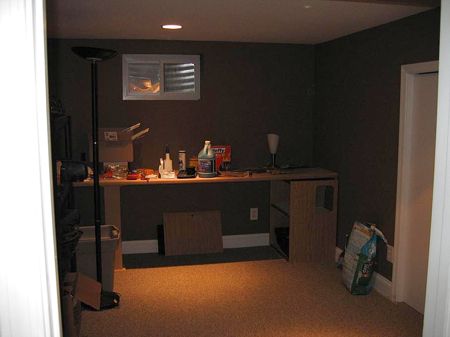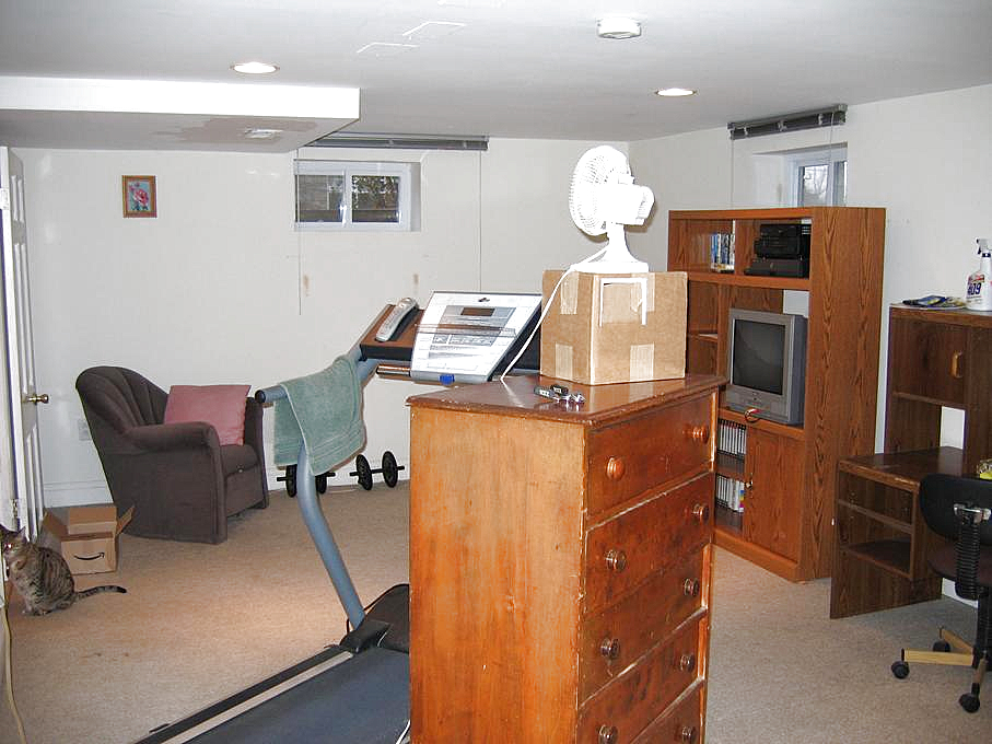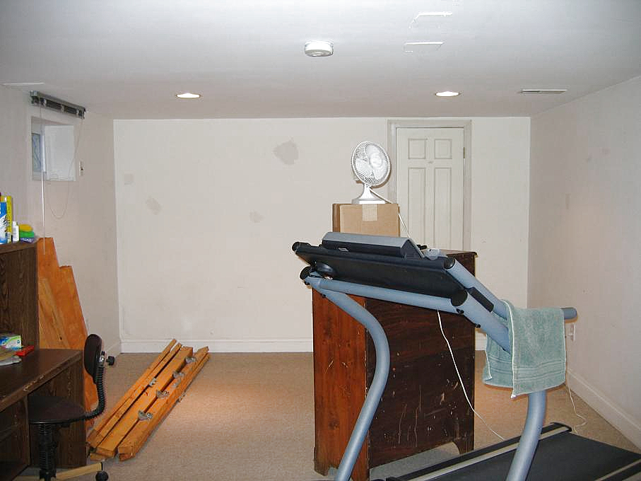 Now let's head down to the basement. Going down to the main room and looking to the right, we see the exercise room. Turning to the left we see the other half. Stepping outside of the exercise room, we can look down the basement hallway toward the basement bathroom. If we walk down the hall and turn right, we can see the tool room.