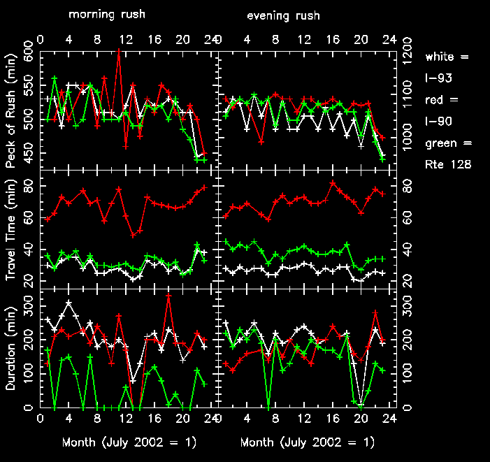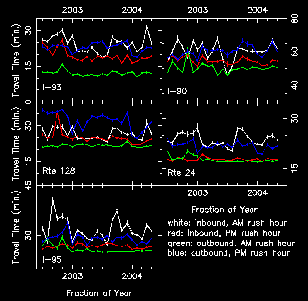 - The travel times for I-93 and Rte 128 are fairly constant over these