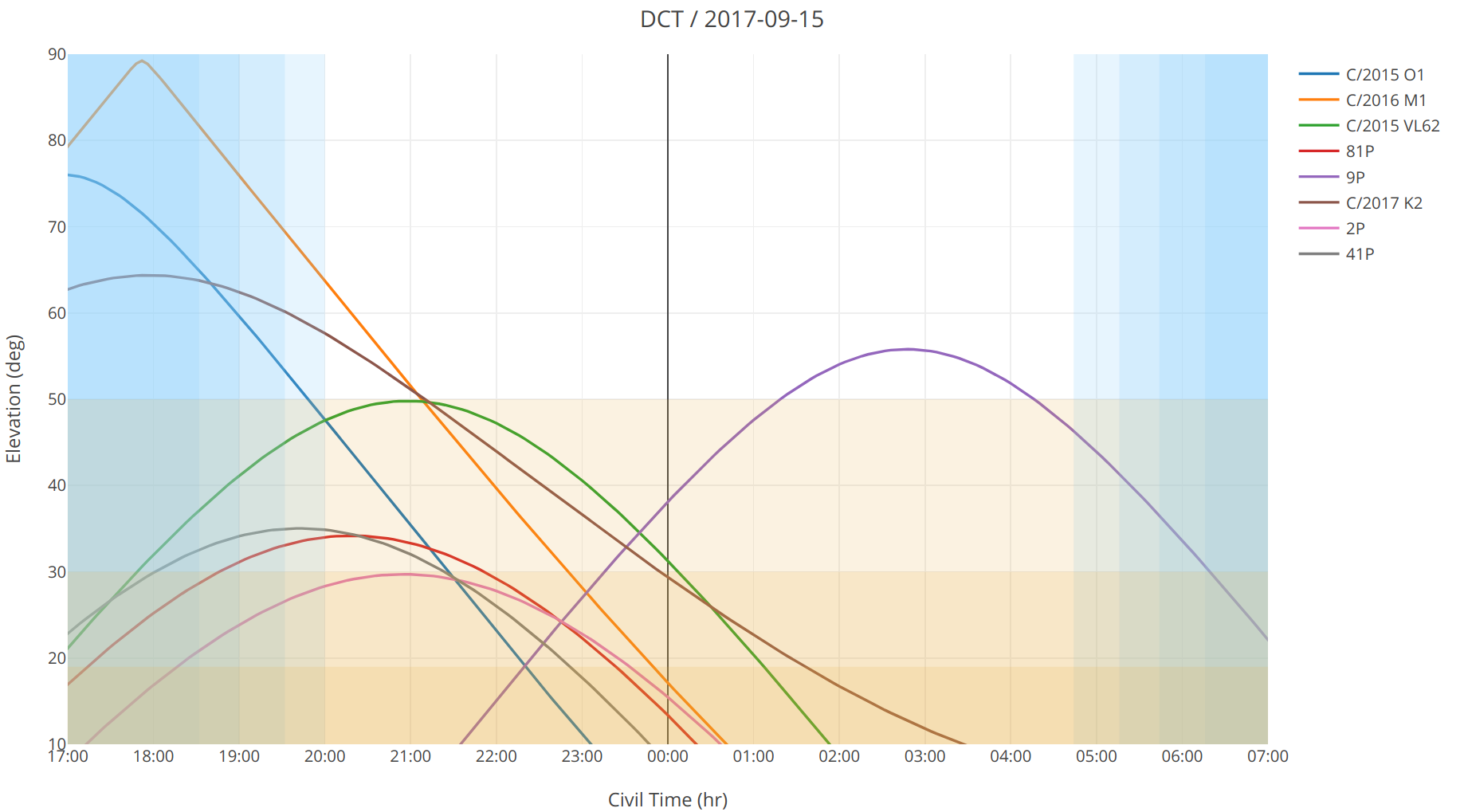 elevation is an online observation planning tool that runs as a web app. It plots the elevation of comets, asteroids, and fixed targets throughout the night for a specific observatory site: