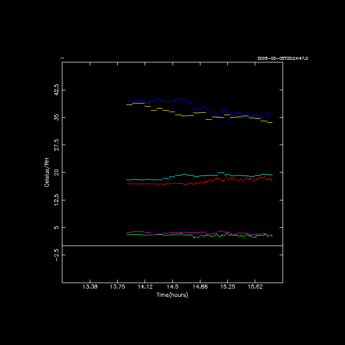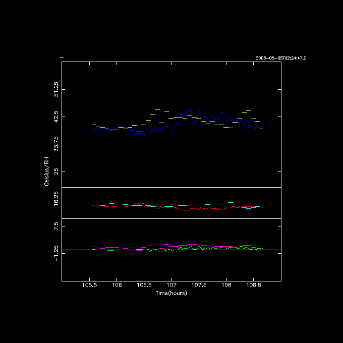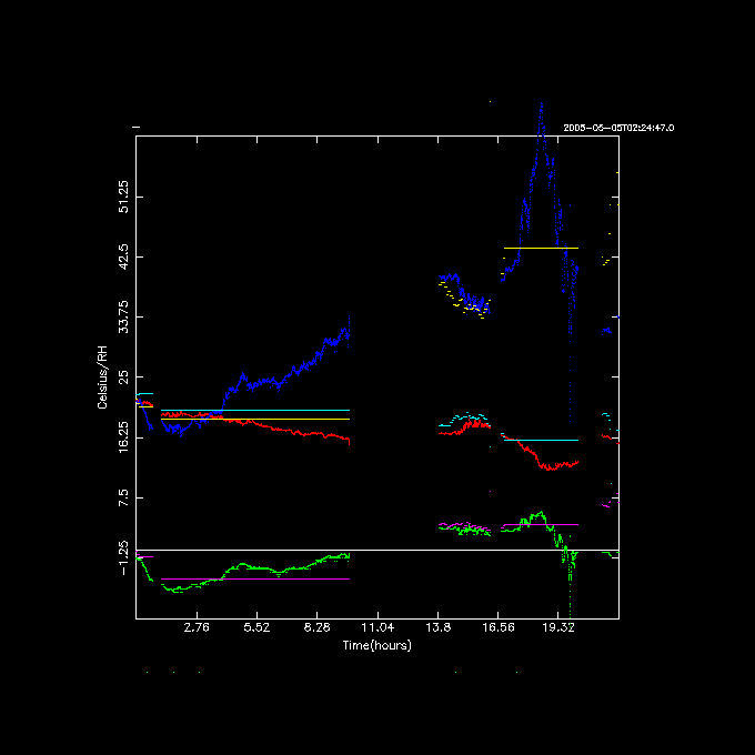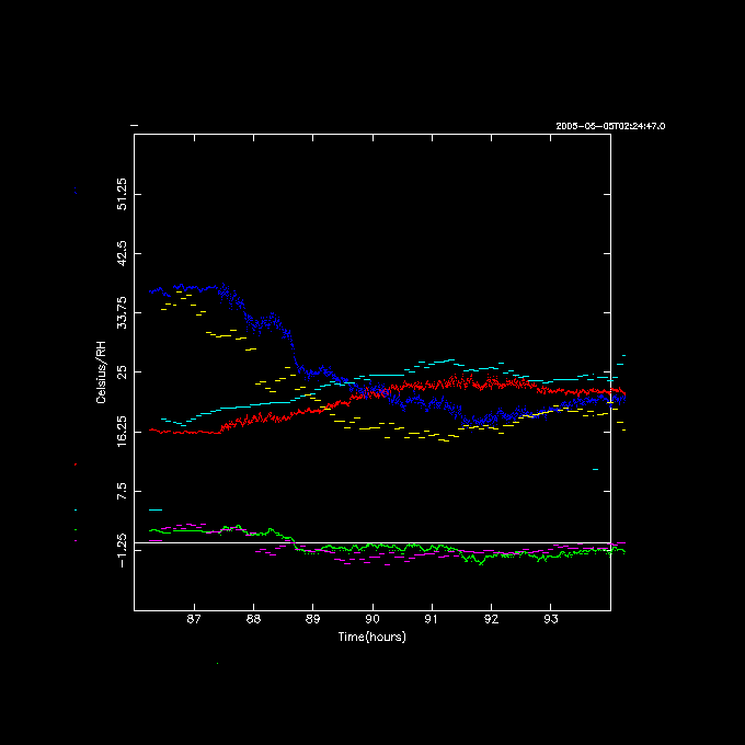 Below are some comparisons of the WS (weatherstation) and DPS (dew point sensor) on May 5, 2005, starting at 02:24:47.0 UT. WS is shown in purple (Td), light blue (Ta) and yellow (RH), whereas DPS is green (Td), red (Ta) and blue (RH).