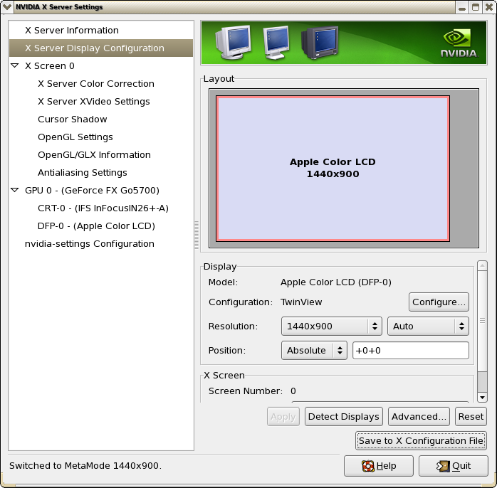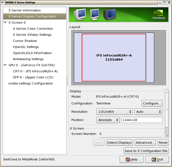 For the remainder of this article, I will refer to the laptop display unit as "LCD" and the external display unit as "CRT". The latter one could be a real monitor, or a projector unit (or "beamer" as our European collegues call them). There is also a mode (called twinview) where you can display two different view on the LCD and on the CRT. Your graphics card and X server will need to know about this in order to work.