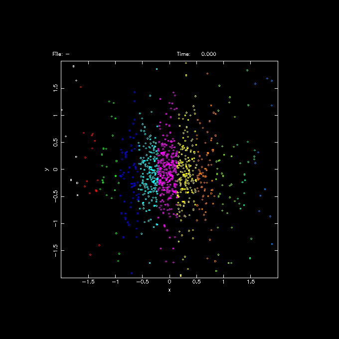 $ snapplot plummer.dat psize=0.05 yapp=3/xs $ mkplummer - 1000 | snapplot - psize=0.05 'color=(x+2)/5' yapp=pretty.gif/gif
