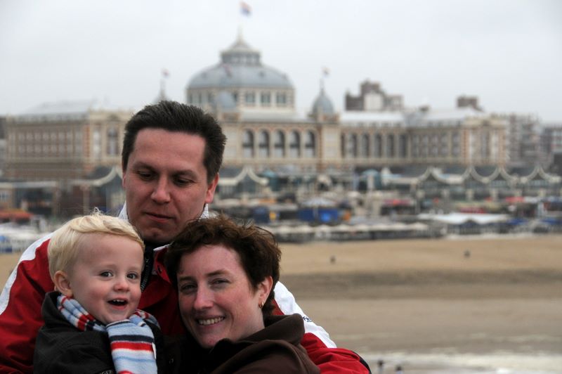 Leiden2010 -- Walter, Paula and Jarid on the pier looking back at the Kurhaus