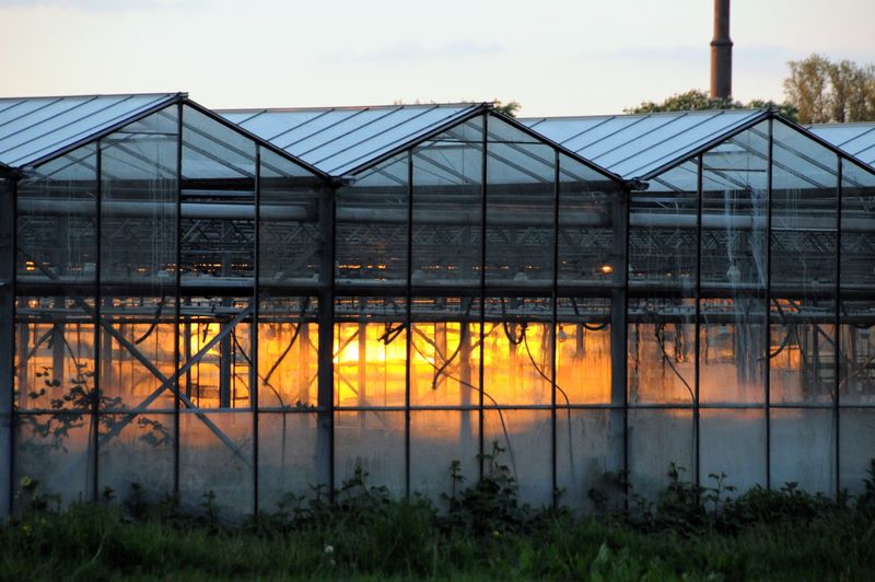 Leiden2010 -- reflections of the sunset in the 'kassen', the place for controlled growth in this unpredictable weather