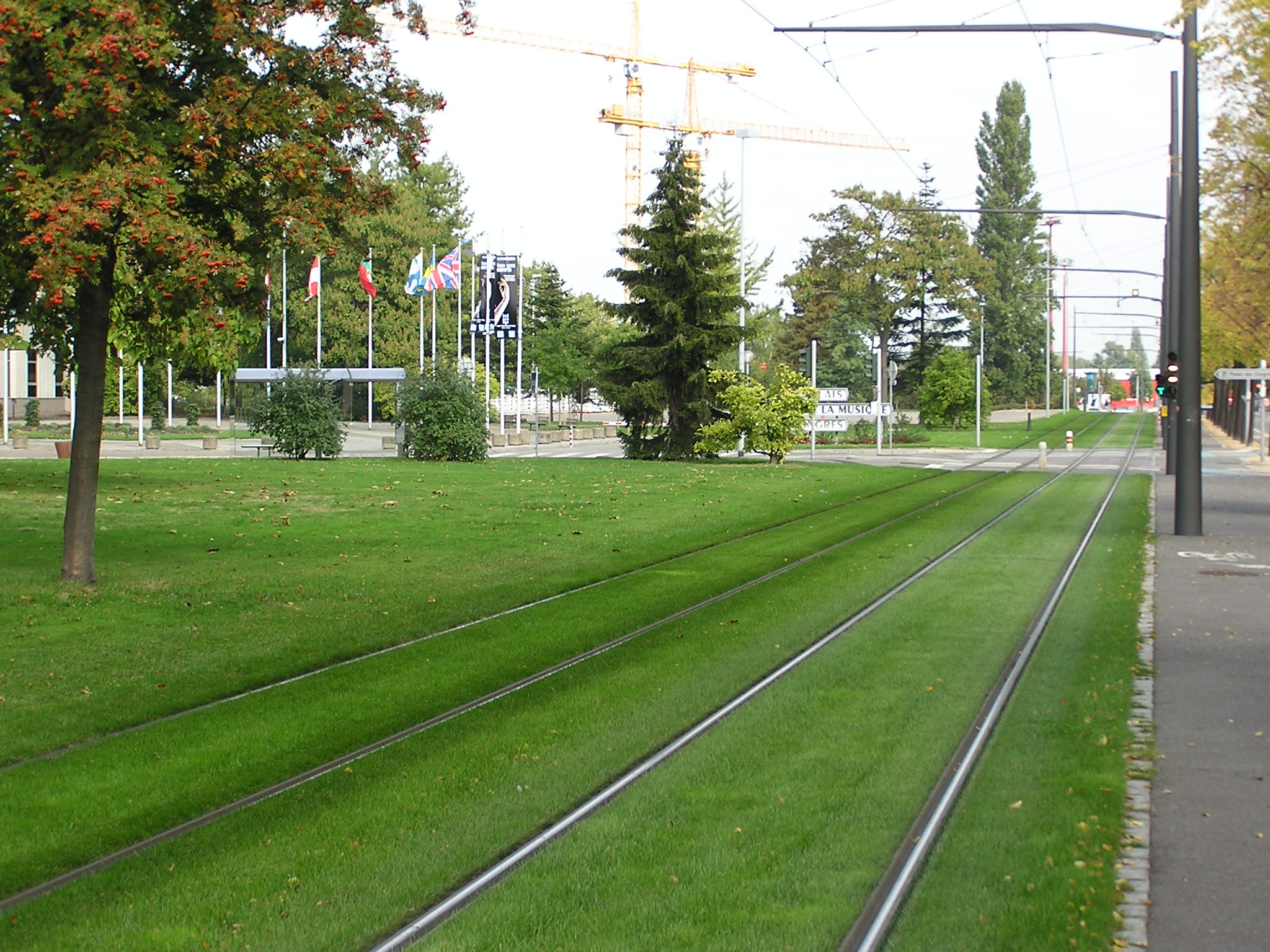 The neatly maintained grassy areas for the trams
