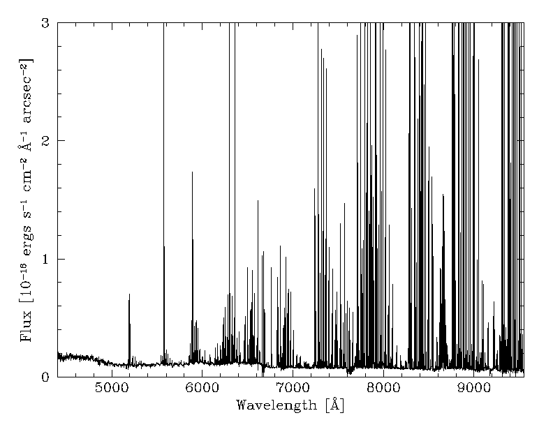 Spectrum of the sky at visible wavelengths from the UVES high resolution echelle spectograph on the VLT in northern Chile.